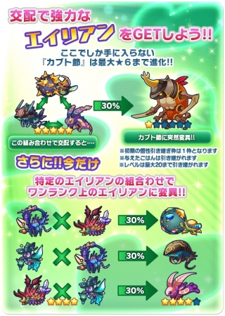 3月31日(金)15:00から4月7日(月)14:59の期間において、クエストやガチャで手に入れたエイリアンを、特定の組み合わせで交配することで、より強力なエイリアンにできる交配イベントを開催いたします。皆様のリクエストにお応えして、「カブト節」が再登場します!突然変異の組み合わせを公開!!