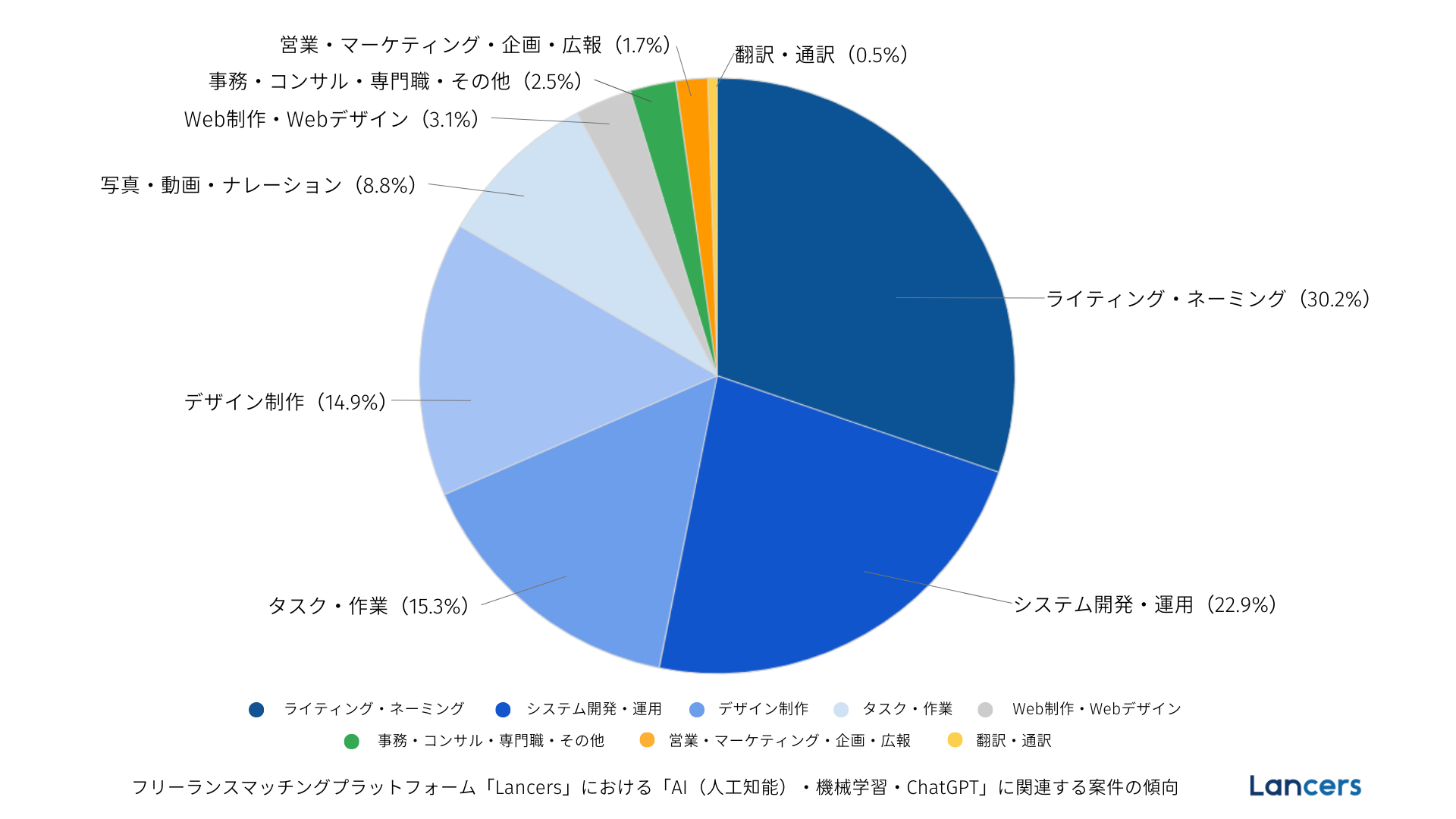 2023年1月~8月までのランサーズにおける「AI(人工知能)・機械学習・ChatGPT」に関連する案件*の傾向として、最も多いカテゴリは「ライティング・ネーミング」(30.2%)、次いで「システム開発・運用」(22.9%)となっており、AIを活用したライティングだけでなく、より専門的な知識や技術が必要となる「システム開発・運用」の案件もご依頼されております。