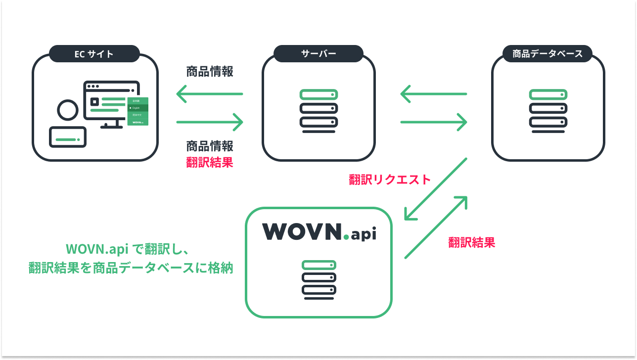 WOVN.api のインターフェースを通じて授受されるデータに対して、WOVN の多言語化のコア機能と連携することにより、WOVN.io がもつサービスも合わせてご利用いただくことが可能になります。