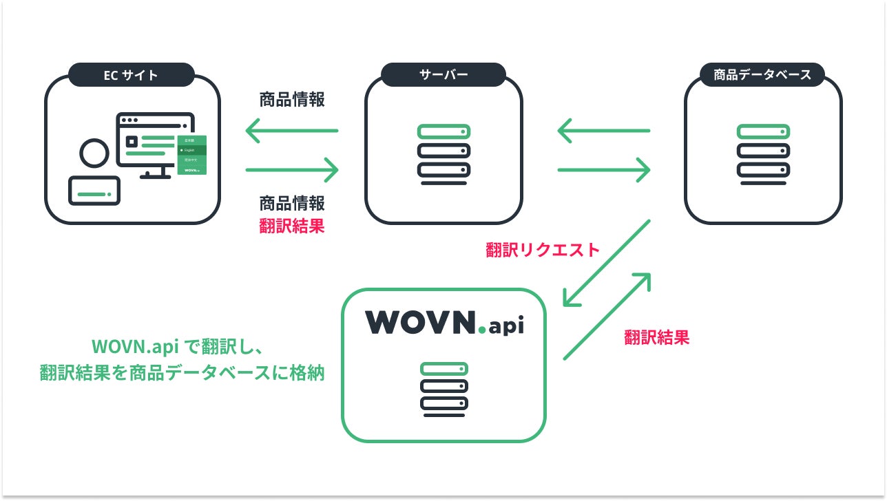 Web サイトのみならず、社内で保有する商品データベースも WOVN.api で多言語化可能になります。また、商品情報の追加を自動で検知し、自動翻訳も可能にします。