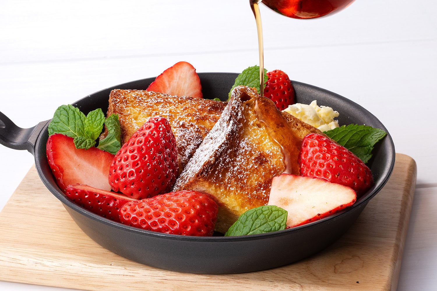 「苺キャラメルフレンチトースト」のこだわりは、MIYABIだからこそ味わえる“外はサクサク、中はふわふわ”とした食感です。その食感を作り上げるために、特製のアパレイユはフレッシュクリームやキャラメルシロップのバランス、パンにしみこませる量まで何度も試作を重ねました。最後にトースターで表面を焼き上げることで香ばしく仕上がり、ふわふわ食感とのコントラストが楽しめます。フレッシュな苺と一緒に頬張ると、甘酸っぱさが華やかなアクセントになります。お好みでキャラメルソースを上から“追いがけ”すれば、甘党も、キャラメル好きも大満足の幸せな味わいです。