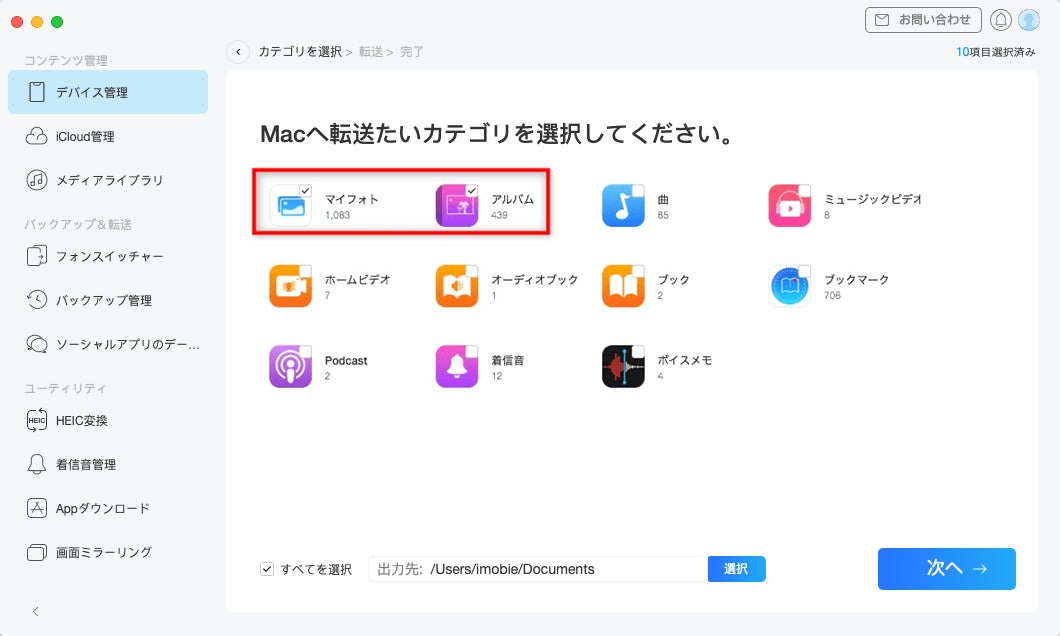 手順3.「マイフォト」と「アルバム」の2つの項目にチェックをいれて、次へボタンをクリックします。下の出力先をクリックすると、写真の保存場所も設定できます。