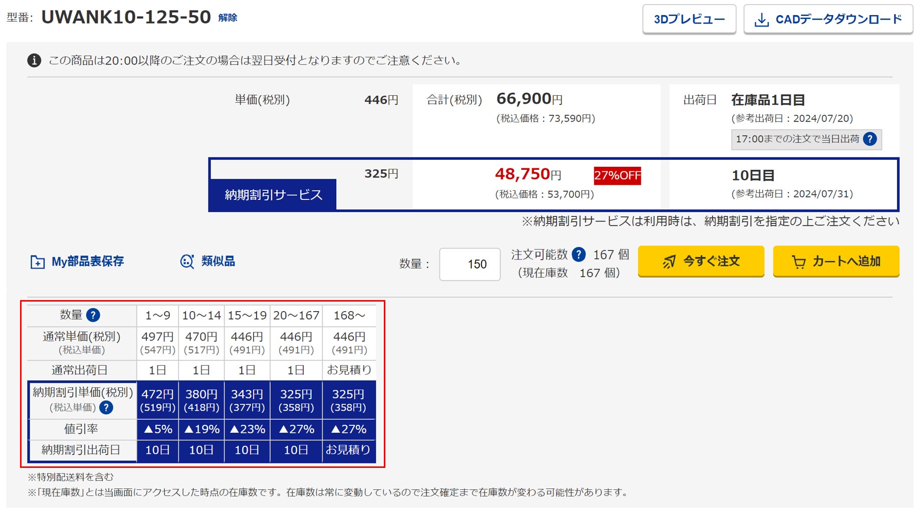 納期割引サービスの対象商品ページには、納期割引単価や値引率、納期割引出荷日が表示されます。