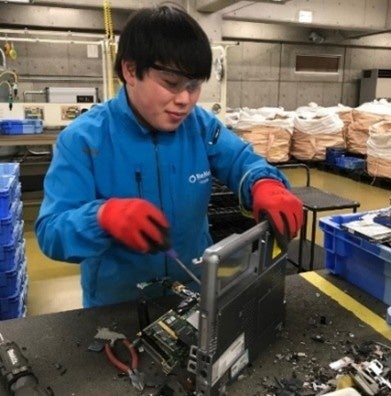 リネットジャパンは、環境省・経済産業省から小型家電リサイクル法に基づく認定を取得し、佐川急便の物流網を活用してパソコン・小型家電等の回収・データ消去・リサイクルを行っています。回収したパソコンは、単品管理・データ消去を行った後、1台ずつ手作業で分解し再資源化処理を行っています。この手分解の工程では、約 30 人の知的障がいのある方が通常社員と同様、一般就労で活躍しており、回収量が増えれば障がいのある方の雇用も拡大するモデルに取り組んできました。また、グループ会社で運営する就労継続支援B型事業所は、愛知県1位の平均工賃月5万円以上を実現しています。