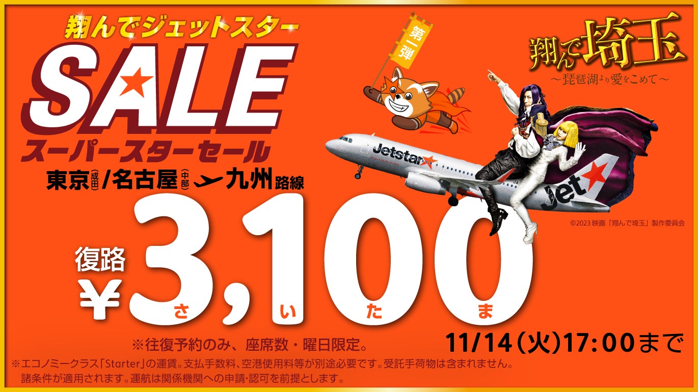 ジェットスター・ジャパン株式会社(本社:千葉県成田市、代表取締役社長:片岡優、以下:ジェットスター)は、11月23日(木・祝)全国公開の映画『翔んで埼玉 ~琵琶湖より愛をこめて~』とのコラボレーション企画として、「翔んでジェットスターセール」を全3回実施します。第一弾は、映画のタイトルにちなんで、往復購入で九州路線復路が3,100(さいたま)円*になるセールを11月10日(金)17時より開催します。