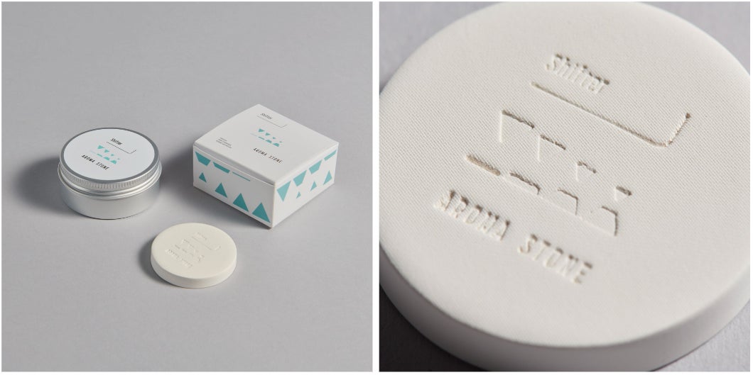 フレグランスミストにあわせ、アロマストーンも新発売。Shifterのロゴと時間が移りゆく砂時計をイメージしたアイコンがデザインされています。