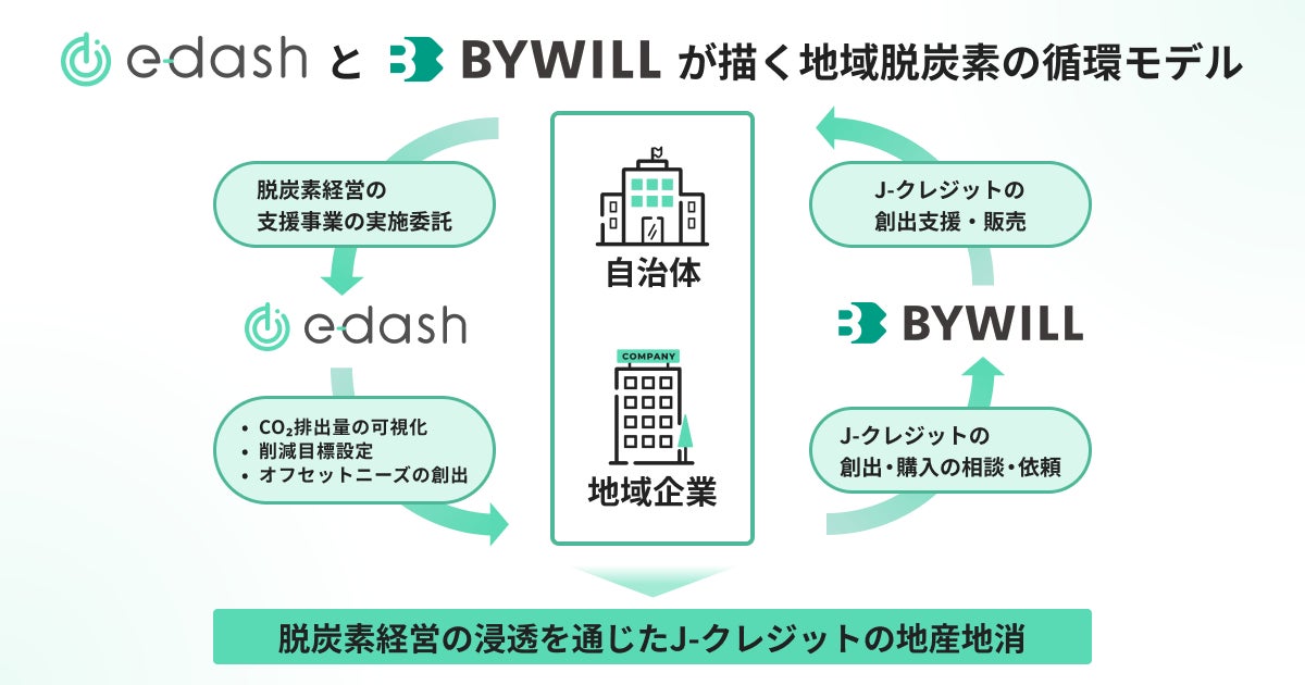 これを踏まえ、バイウィルとe-dashがもつサービスの強みを活かし、相互に顧客紹介を行うことで地域における脱炭素経営およびJ-クレジットの地産地消の推進を目指すべく、本業務提携に至りました。