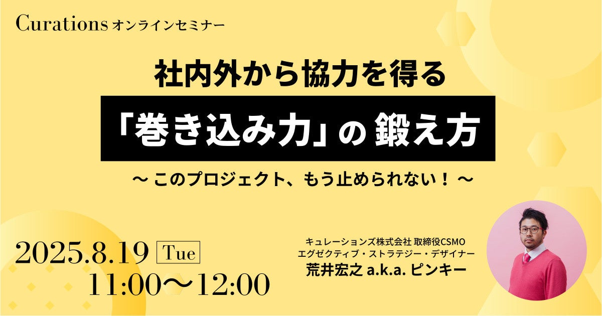 顧客企業のビジネス変革を成功に導くキュレーションズ株式会社(本社:東京都渋谷区、担当:野崎、以下当社)は、「社内外から協力を得る「社内外から協力を得る「巻き込み力」の鍛え方 〜このプロジェクト、もう止められない!〜」を2025年8月19日(火)に開催いたします。
