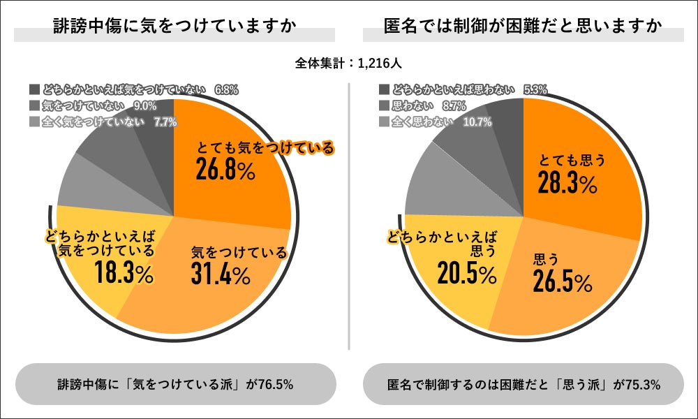 回答者全体の1,216人に誹謗中傷に気をつけているかを聞くと、「気をつけている派」が76.5%と過半数を占め、内訳は「とても気をつけている」26.8%、「気をつけている」31.4%、「どちらかといえば気をつけている」18.3%でした。同回答者に誹謗中傷の制御が匿名では困難かを聞くと、困難だと「思う派」が75.3%と過半数を占め、内訳は「とても思う」28.3%、「思う」26.5%、「どちらかといえば思う」20.5%でした。