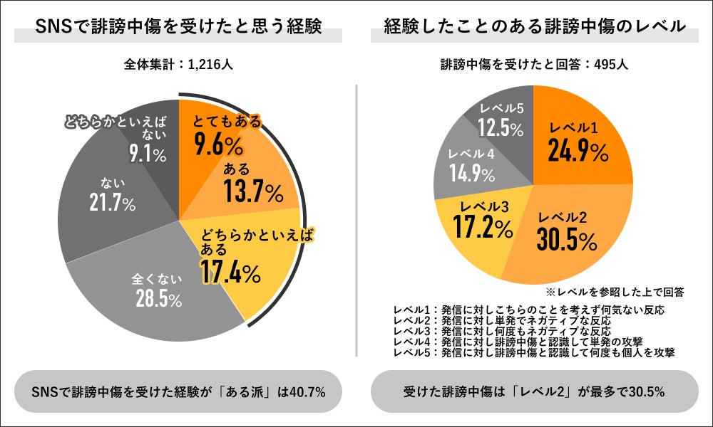 回答者全体の1,216人にSNSで誹謗中傷を受けた経験の有無を聞くと「ある派」は40.7%となり、内訳は「とてもある」9.6%、「ある」13.7%、「どちらかといえばある」17.4%でした。SNSでの誹謗中傷を受けたことがあると回答した495人にそのレベルを聞くと「レベル2:発信に対し単発でネガティブな反応」が30.5%で最多となりました。