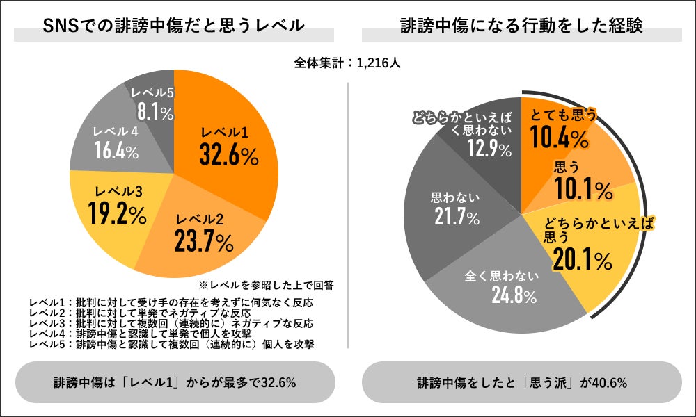 回答者全体の1,216人にSNSでの誹謗中傷だと思うレベル(※3)を聞くと、「レベル1:批判に対して受け手の存在を考えずに何気なく反応」が32.6%で最多となりました。同回答者にSNSで誹謗中傷になる行動の有無を聞くと、したと「思う派」は40.6%となり、内訳は「とても思う」10.4%、「思う」10.1%、「どちらかといえば思う」20.1%でした。