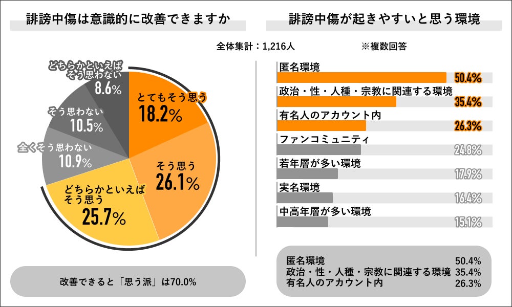 回答者全体の1,216人に誹謗中傷は意識的に改善可能かを聞くと「そう思う派」が70.0%と過半数を占め、内訳は「とてもそう思う」18.2%、「そう思う」26.1%、「どちらかといえばそう思う」25.7%でした。同回答者に誹謗中傷が起きやすいと思う環境を聞くと「匿名環境」が50.4%で最多となり、次いで「政治・性・人種・宗教に関連する環境」が35.4%、「有名人のアカウント内」が26.3%と上位3つの回答となりました。