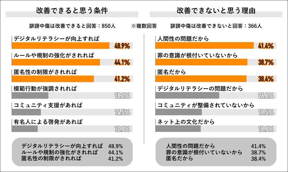誹謗中傷は意識的に改善できると回答した850人にその条件を聞くと「デジタルリテラシーが向上すれば」が48.9%で最多となり、次いで「ルールや規制の強化がされれば」が44.1%、「匿名性の制限がされれば」が41.2%と、上位3つの回答となりました。改善できないと回答した366人にその理由を聞くと「人間性の問題だから」が41.4%で最多となり、次いで「罪の意識が根付いていないから」が38.7%、「匿名だから」が38.4%と、上位3つの回答となりました。