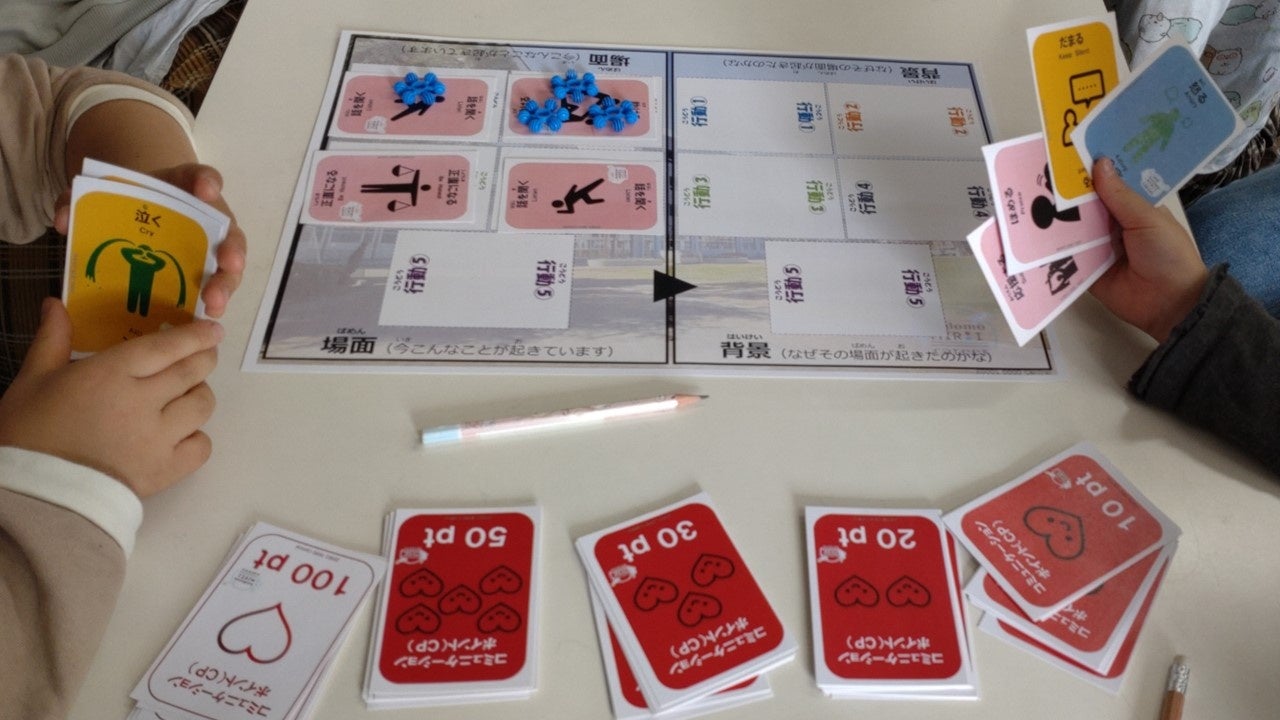 また、神戸市本庄学童保育コーナーに提供した、“コミュニケーション”のテーマは出題された「場面」に対して、適切なアクションが記載されたカードを選択しポイント獲得を目指すものです。さらに、進行の途中で「場面」の後ろに隠れていた「背景」が追加で発表され、その「背景」も理解した上で改めてカードを選択します。2022年11月19日(土) の体験会に参加した子どもたちは、なぜその場面が起きているのか、その背景をしっかりと考えることで上手なコミュニケーションを取れるということを学びました。