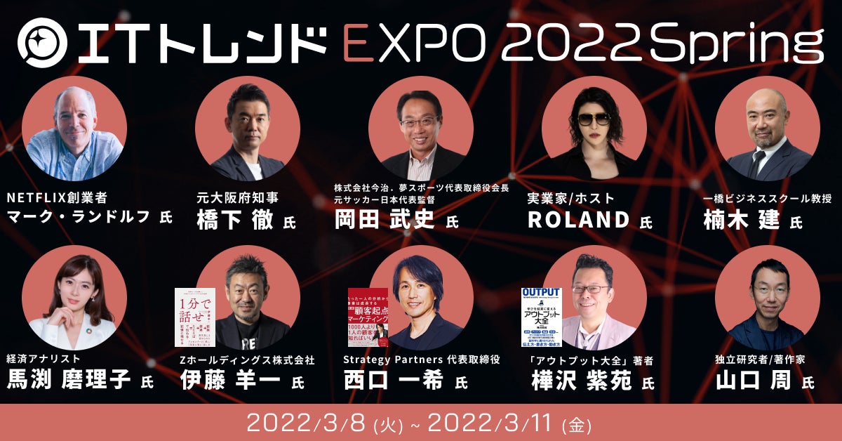 株式会社イノベーション(マザーズ 証券コード3970)のグループ会社である、株式会社Innovation & Co.(本社:東京都渋谷区、代表取締役社長:遠藤俊一、以下「Innovation & Co.」)は、第5回目の開催となる業界最大級のオンライン展示会「ITトレンドEXPO2022 Spring」を、2022年3月8日(火)〜 3月11日(金)に開催。豪華特別ゲストの登壇、100以上の講演を公開したことをお知らせします。