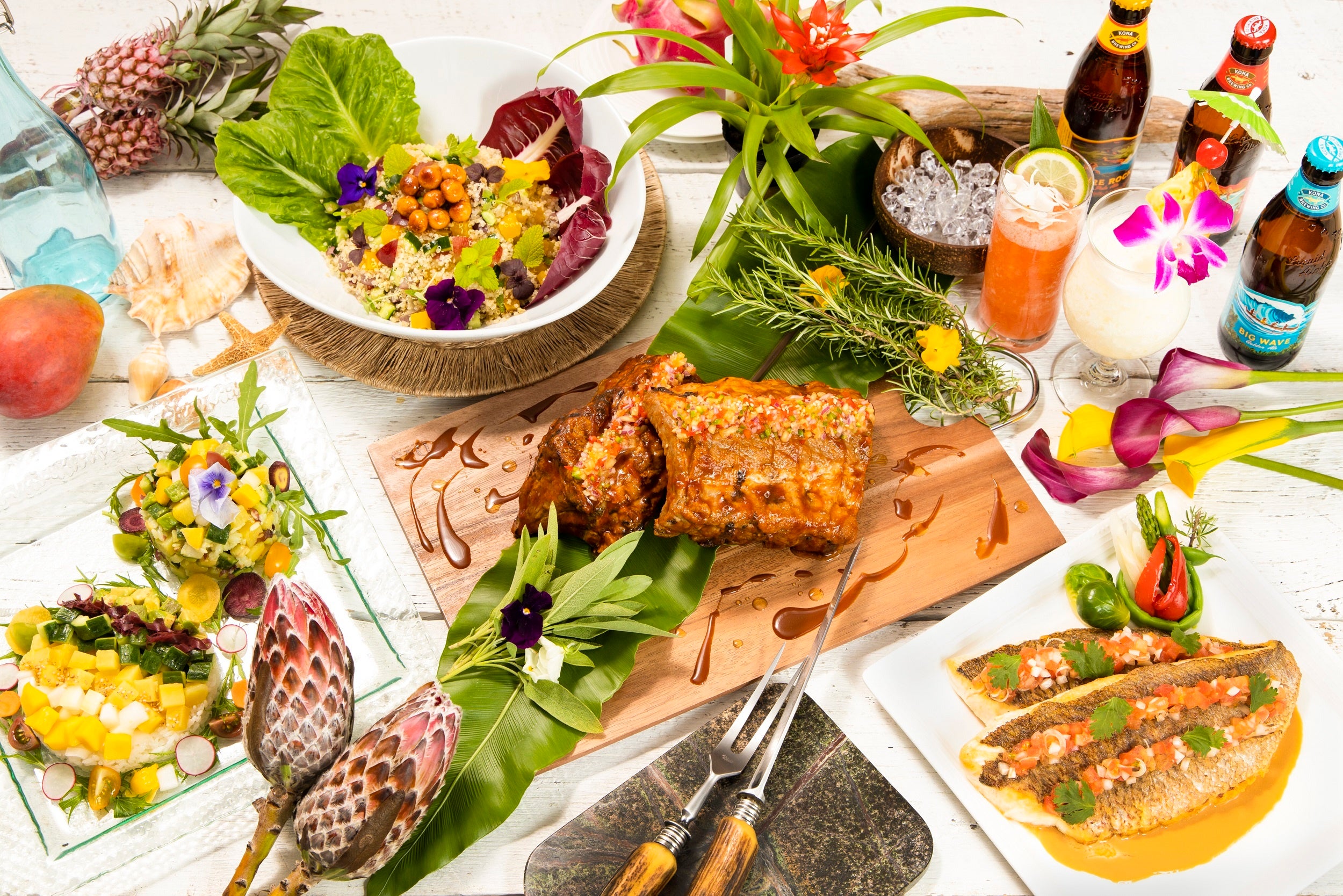 前菜には、スーパーフードのキヌアやイエロービーツなど、ヘルシーな食材をふんだんに使い、ミントやバジル、ライムジュースでさっぱりとした味わいに仕上げた「サラダボウル」。メインディッシュには、パプリカ、赤タマネギ、グリーンチリペッパー、コリアンダー、パイナップルを混ぜたパイナップルサルサと一緒にジューシーに焼き上げた「バーベキューリブ」や、かば焼きのたれと白ワインを絶妙に合わせた照り焼き風のバターソースをかけて仕上げた「白身魚のソテー」。さらに、サツマイモをタマネギ、アボカド、オイキムチ、パパイヤなどと一緒にご飯とあわせ、ゴマやスパイス、サンバルソースなどでエスニックなテイストに仕上げた「ポキボウル」など、まるでハワイにいるかのような本格メニューが日替わりで楽しめます。さらに、シェラトン・ワイキキのエグゼクティブシェフ、マシュー・ナウラ(通称:シェフマット)のシグニチャーディッシュである、チェリージュースと一緒に柔らかくなるまでビーフを長時間煮込んだ「シェフマットのビーフブレゼ」もメニューに加わります。
