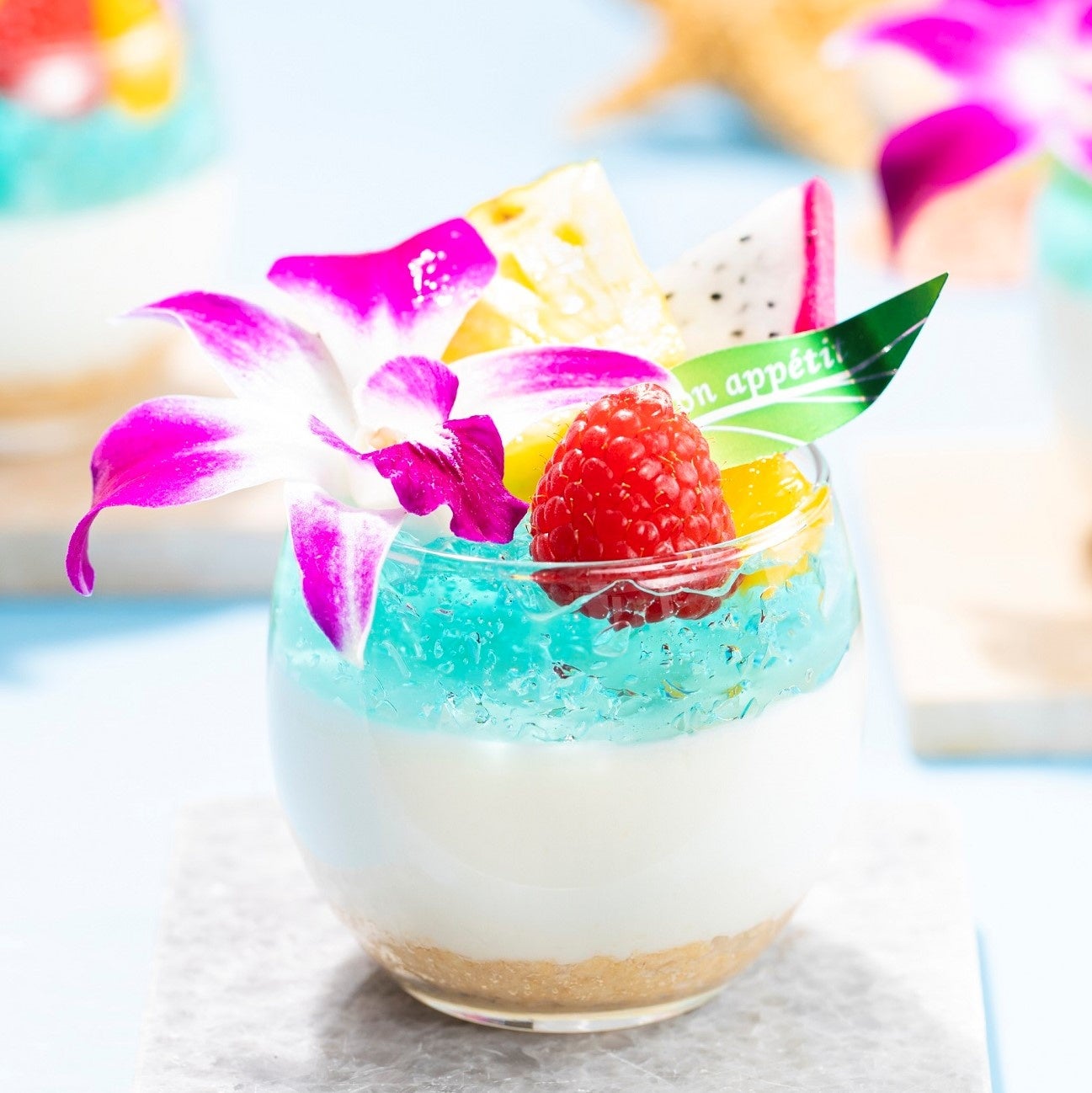 ホワイトチョコレートでコーティングしたクッキーを底にして、ピンクグレープフルーツのコンフィチュールとココナッツのダックワーズを閉じ込めたグレープフルーツのムース、さらに透き通った青いカラーが印象的なブルーハワイのゼリーを重ねました。トップにはパイナップル、ドラゴンフルーツ、オレンジ、フランボワーズをのせ、まるでカクテルのような、リゾート感満載のさっぱりとしたグラスデザートに仕上げました。