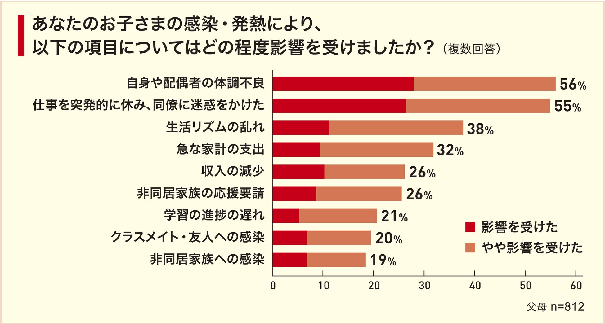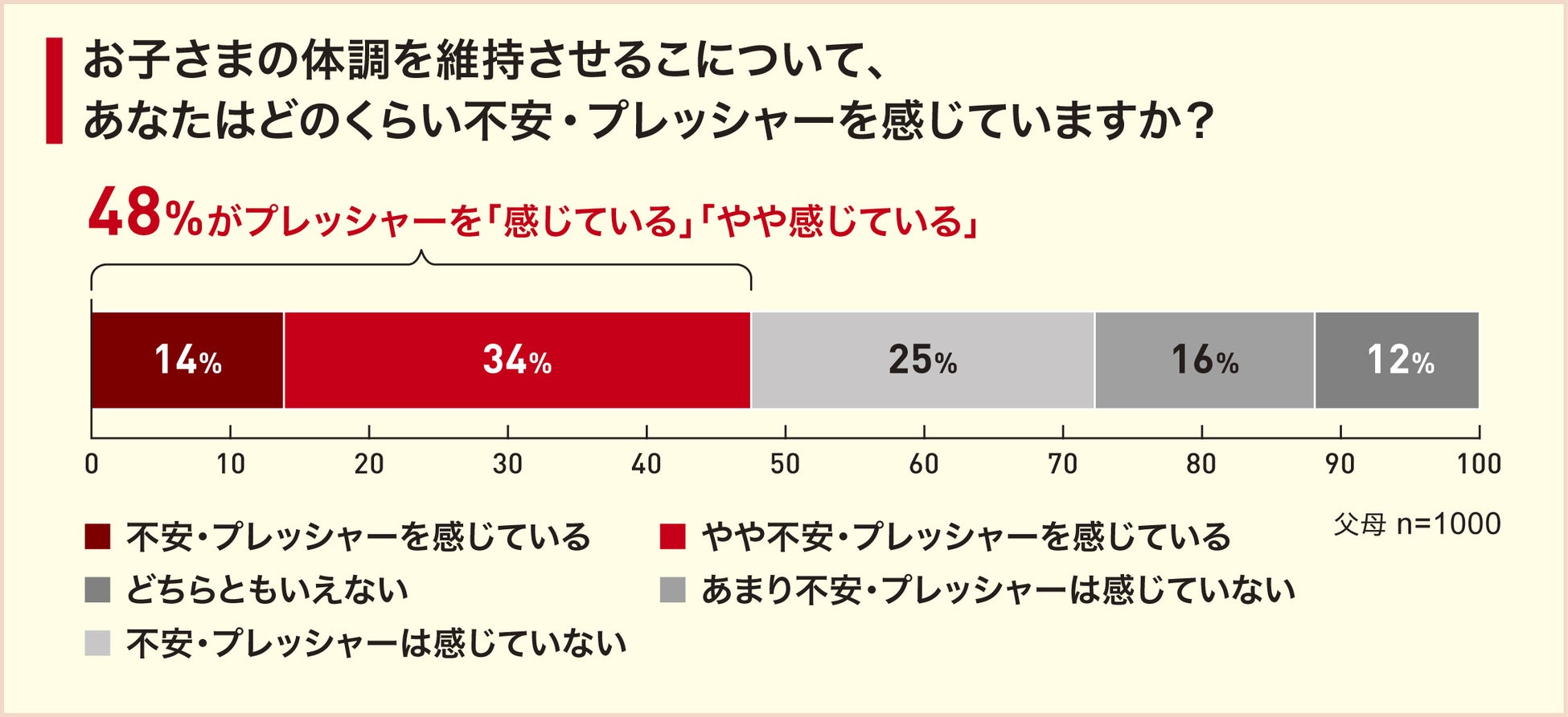 また、核家族の共働き世帯が多いなか、仕事、看病、感染拡大の防止、食事の準備などを並行する負担が親の体調にも影響し、子どもの体調を維持させることにプレッシャーを感じる親は約半数(48%)に上るなど心身への影響が窺えました。