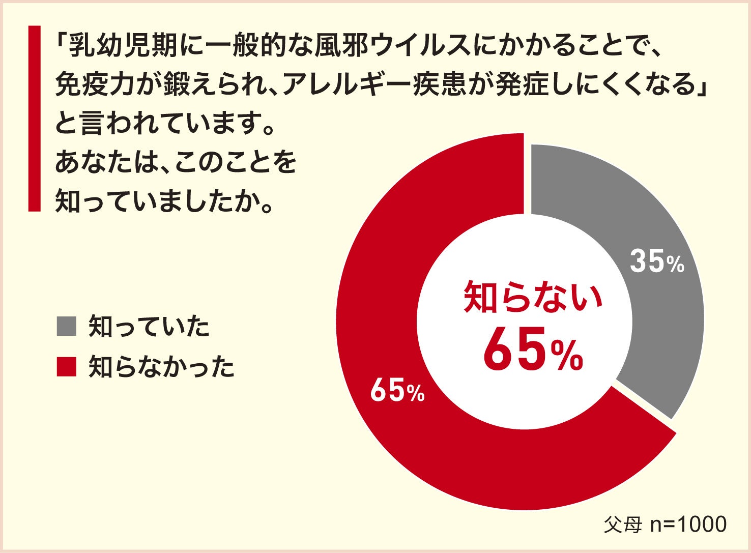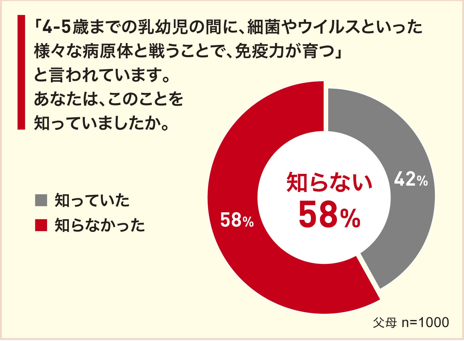 実際に、「乳幼児期に様々な病原体と戦うことで免疫力が育つことを知らない」が58%、「乳幼児期に風邪にかかることでアレルギー疾患にかかりにくくなることを知らない」が65%と、想いに反して、免疫力を育てる具体的な方法を会得できていないという実態が浮き彫りになりました。