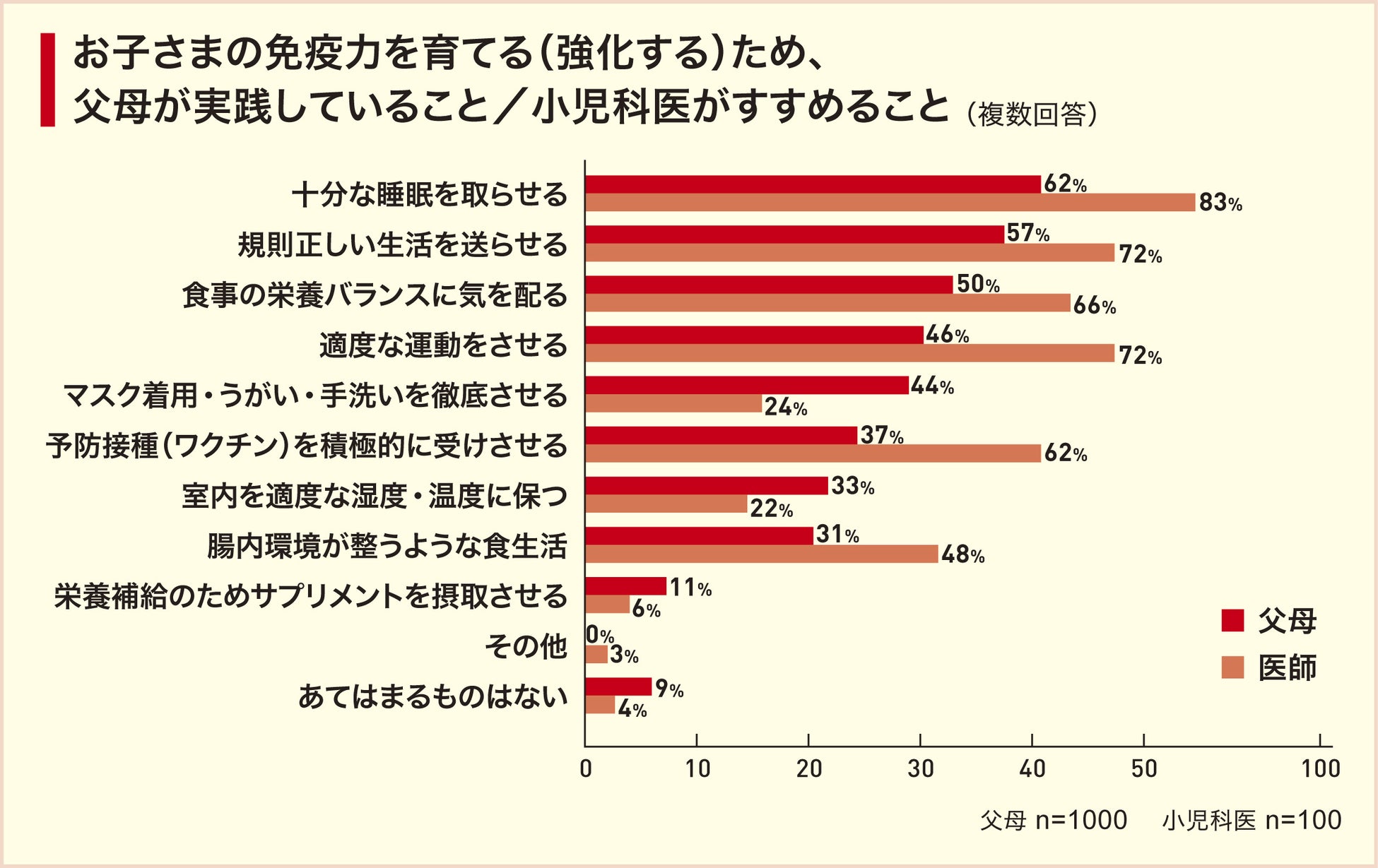 本調査で小児科医がすすめる対策として上位に上がっている項目を意識すると良いと思います。睡眠・運動(特に外遊び)・規則正しい生活を心がけましょう。また、ワクチンの定期接種は、最も確実な免疫強化方法ですので欠かさないことです。食事の面では、腸の免疫系を刺激する発酵食品や緑黄色野菜をあわせて摂るシンバイオティクスをはじめ、さまざまな食品をバランスよく食べさせる工夫が必要です。
