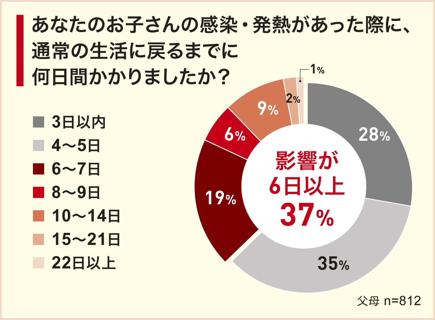 子どもが感染症にかかったことにより父母が受けた影響として、「自身や配偶者の体調不良」(56%)、「突発的に仕事を休み、同僚に迷惑をかけたこと」(55%)となりました。また回答した父母の1/3以上(37%)が、「通常の生活に戻るまでに6日以上を要した」と回答しており、休日を踏まえると、実質1週間は仕事・社会生活に影響したと考えられます。