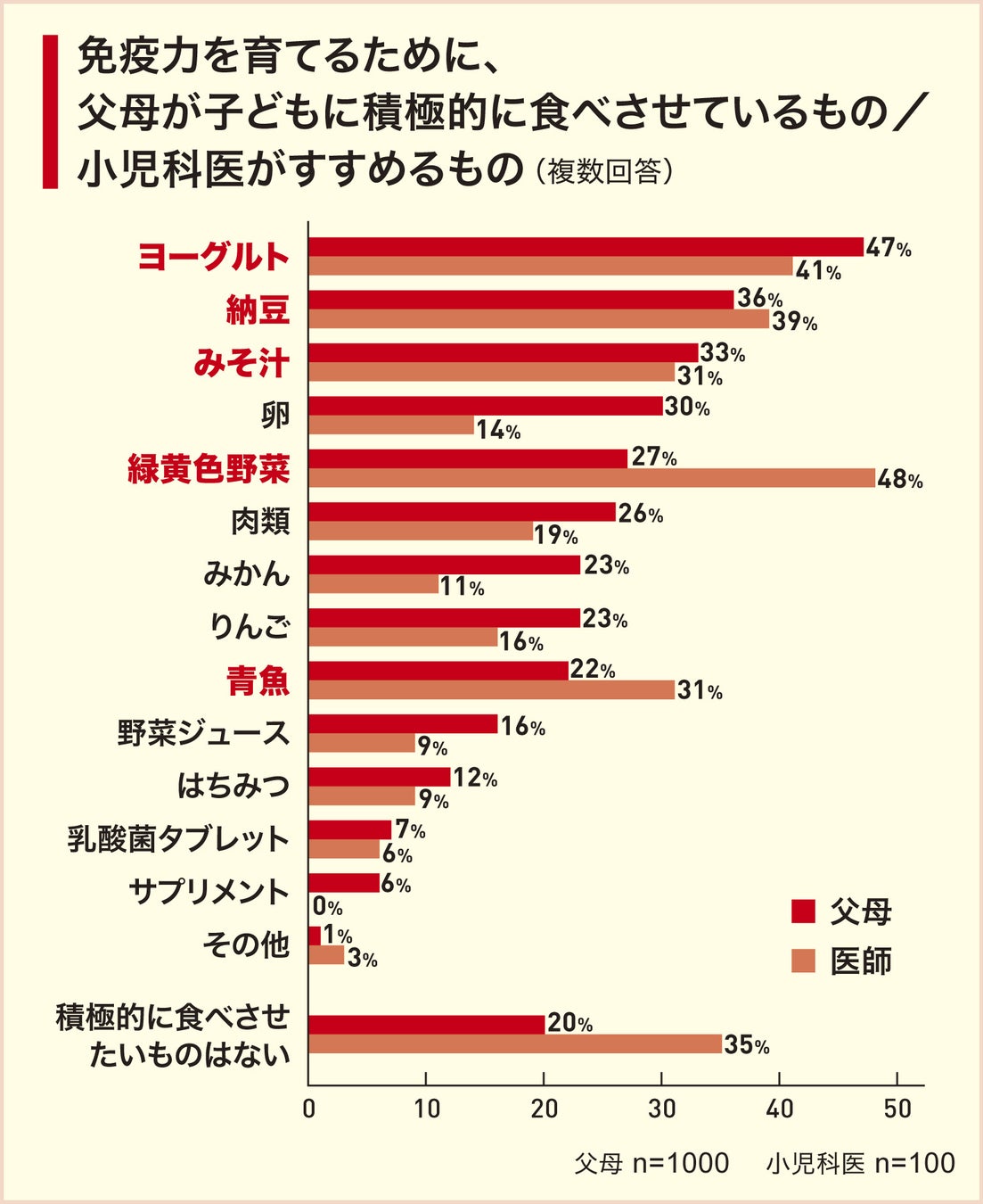 父母が免疫力を育てるために子どもに積極的に食べさせているものは、1位:ヨーグルト(47%)、2位:納豆(36%)、3位:みそ汁(33%)で、いずれも小児科医の回答でもポイントが高い食品でした。