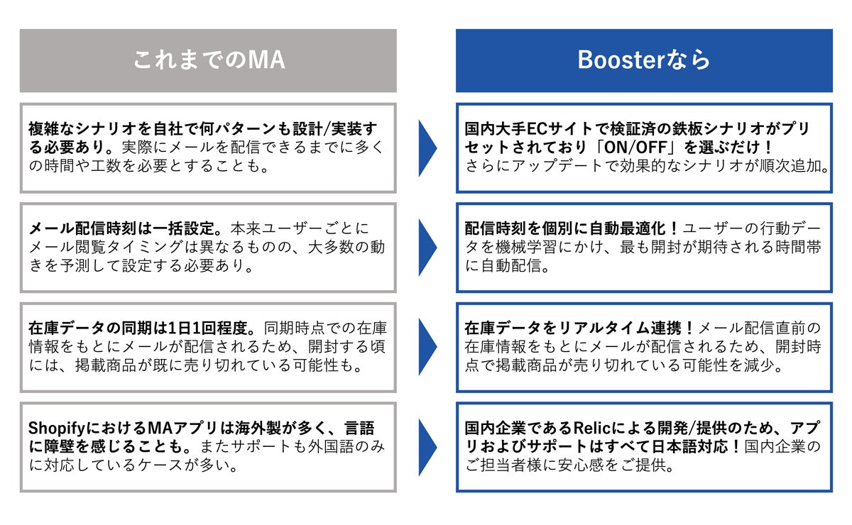 「Booster for Shopify」のベースとなっている「Booster」は、機械学習により、リアルタイムにアクセスログや行動履歴・購買データなどのビッグデータを解析することで、ユーザーの一人ひとりに最適化された顧客体験及び「おもてなし」を提供する仕組みを実装する次世代型マーケティングオートメーション・CRMサービスです。国内最大級のファッションEC「ZOZOTOWN」のマーケティング部長を務めた岡崎徹氏(現株式会社mtc.代表)をアドバイザーに迎え、その経験・知見や技術とRelicの持つアセットを活かした共同開発によって誕生しました。導入した事業者実績の一例として、マスメールと比較して「メール開封率4倍・リンクのクリック率2倍・メール1通あたりの収益5倍」という成果の創出に成功しています。(※5)