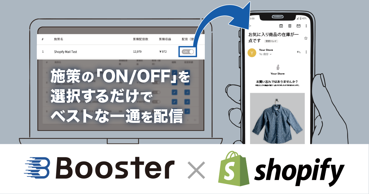 これらの実態を踏まえ、1クリックのみで運用可能なMAツールを低価格で提供することで、より多くのEC事業者の成長を後押ししたいと考え、今回Shopifyと連携し新たに「Booster for Shopify」を展開するに至りました。