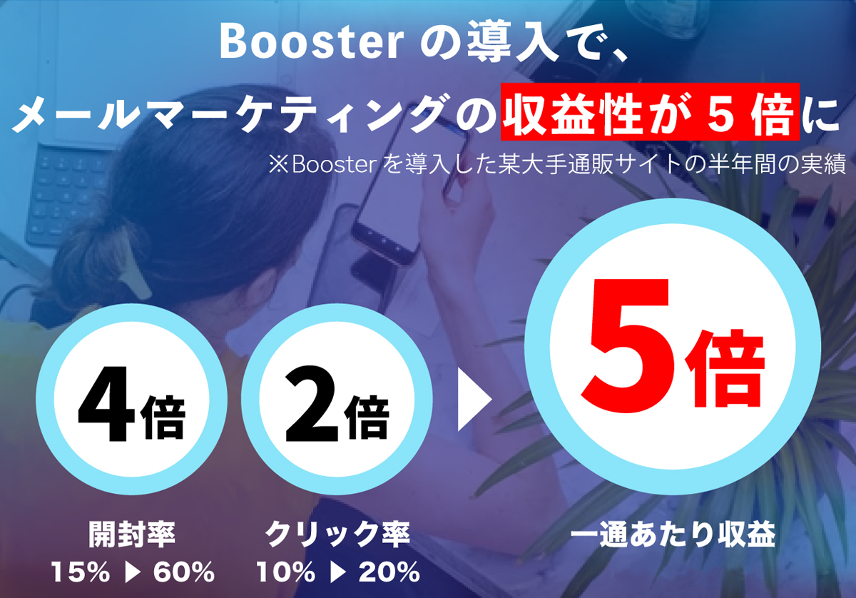「Booster for Shopify」のベースである「Booster」は、主に大規模事業者向けのMAツールとして、数多くのECサイトの拡大に貢献し好評をいただいています。導入いただいた事業者において、従来のメールマガジンと比較してメール1通あたりの収益性を5倍に向上させた実績を創出しました。