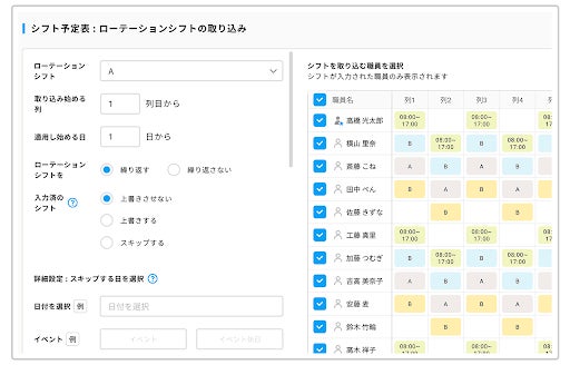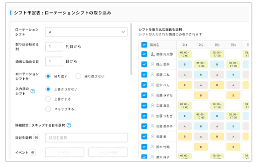 ※ローテーション制のシフトを一括作成できます。細かく取り込み設定ができるので、柔軟にシフトが作成できます。
