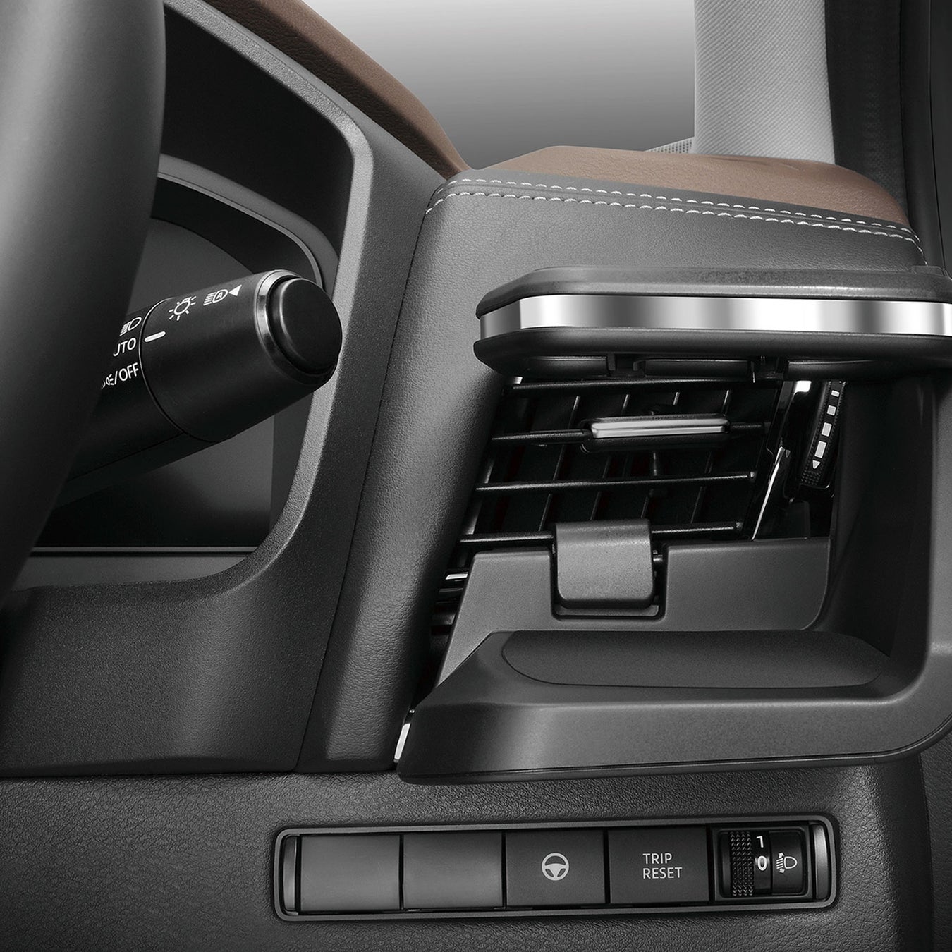 本製品はエアコン吹き出し口に沿うような形状で、壁面にはクルマの内装(樹脂パーツ部)に合わせたシボ加工を施しました。また、ホルダーの天面はドアのスイッチパネル部に合わせたヘアライン処理や各車仕様に合ったメタリックカラーのラインをあしらいました。高級感を意識し、ホルダーを装着しても内装に溶け込むデザインに仕上げました。