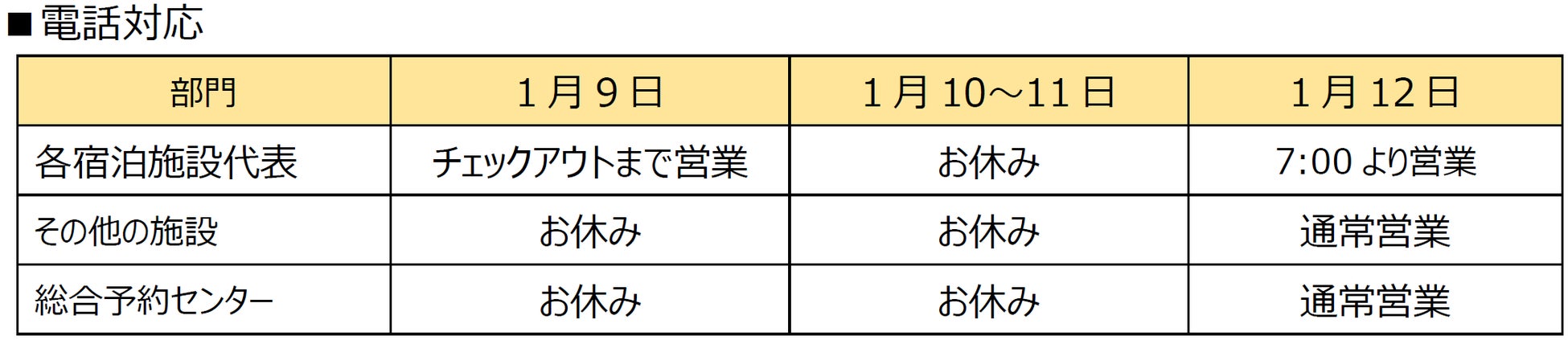 当リゾートでは、お客様の満足度向上のためには、まずスタッフがしっかりと休暇を取り、充実した時間を過ごすことが必要であると考え、“働き方改革”の一環として全施設一斉休館を2020年より毎年実施しています。