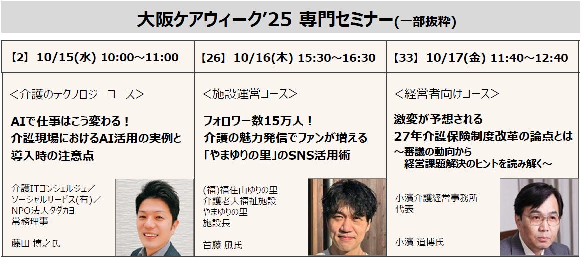 本展では、業界の第一線で活躍する専門家を講師に迎えた「専門セミナー」を同時開催する。経営者向けコースでは小濱介護経営事務所 小濱道博氏が27年介護保険法改正の論点をテーマに講演。また、介護のテクノロジーコースではNPO法人タダカヨ 藤田博之氏が音声入力や記録の自動生成など介護現場ですぐに使えるAI活用について解説。その他、人件費適正化、SNS活用、職員ファーストの職場環境づくりなど、介護事業の課題解決に役立つセミナーが集結。受講に必要な事前申込(無料) は、公式サイトにて受付中。定員間近のセッションもあるため、早めの受講申込をおすすめする。