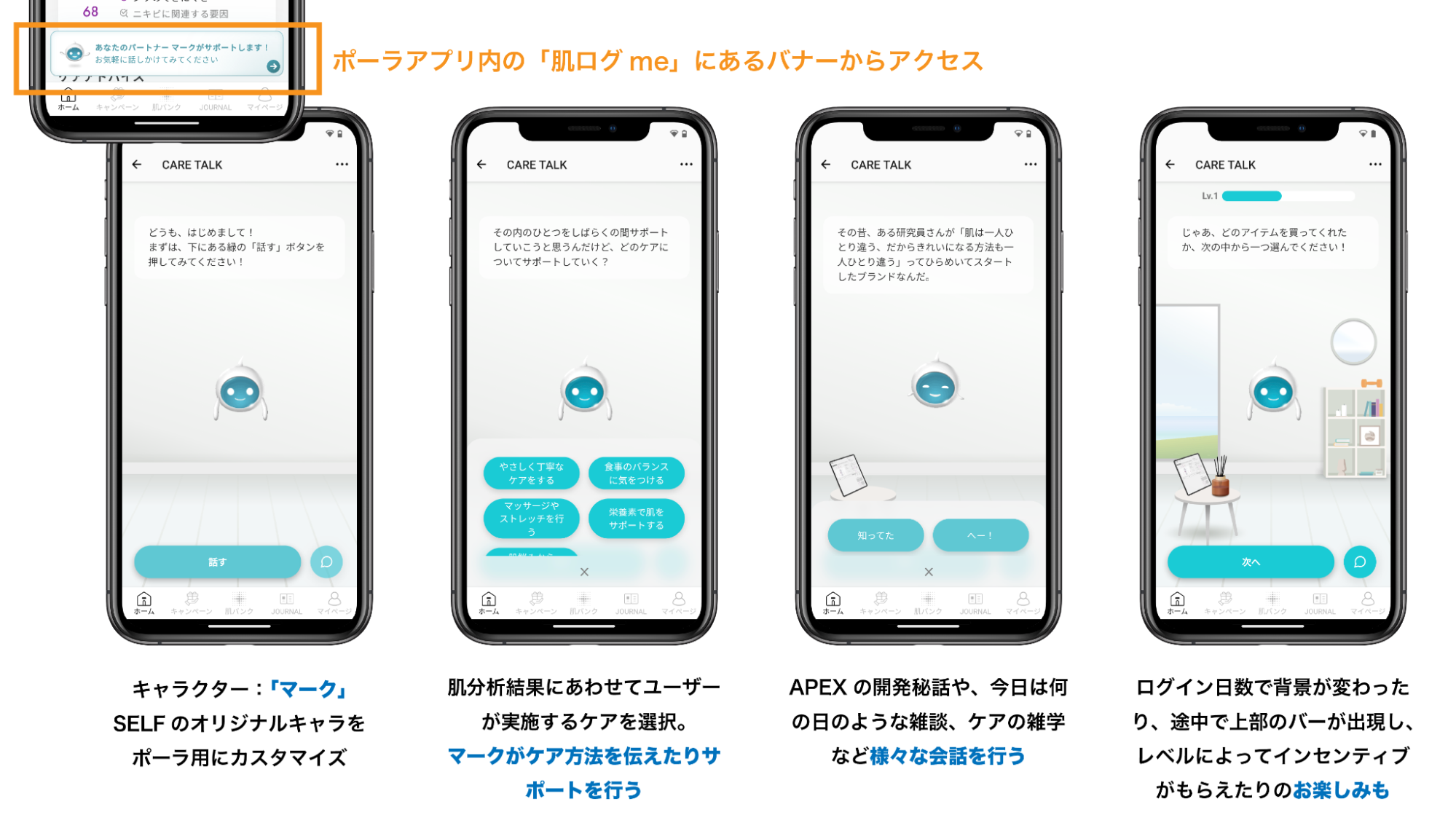 2024年7月のアプリリニューアル合わせて、アプリ内コンテンツ「肌ログme」にSELFの開発・提供するコミュニケーションAI「SELF-AI」を導入いただきました。