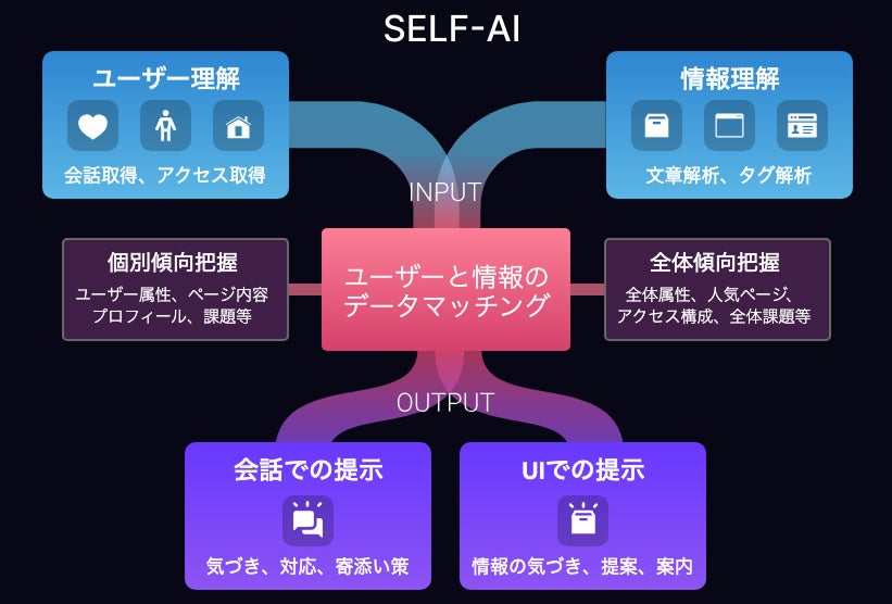 「SELF-AI」は、ユーザーとの”対話”を通して得られたユーザー属性などの情報をもとに、パーソナライズされた情報・コンテンツ提案を行うSELF株式会社独自のAIソリューションです。