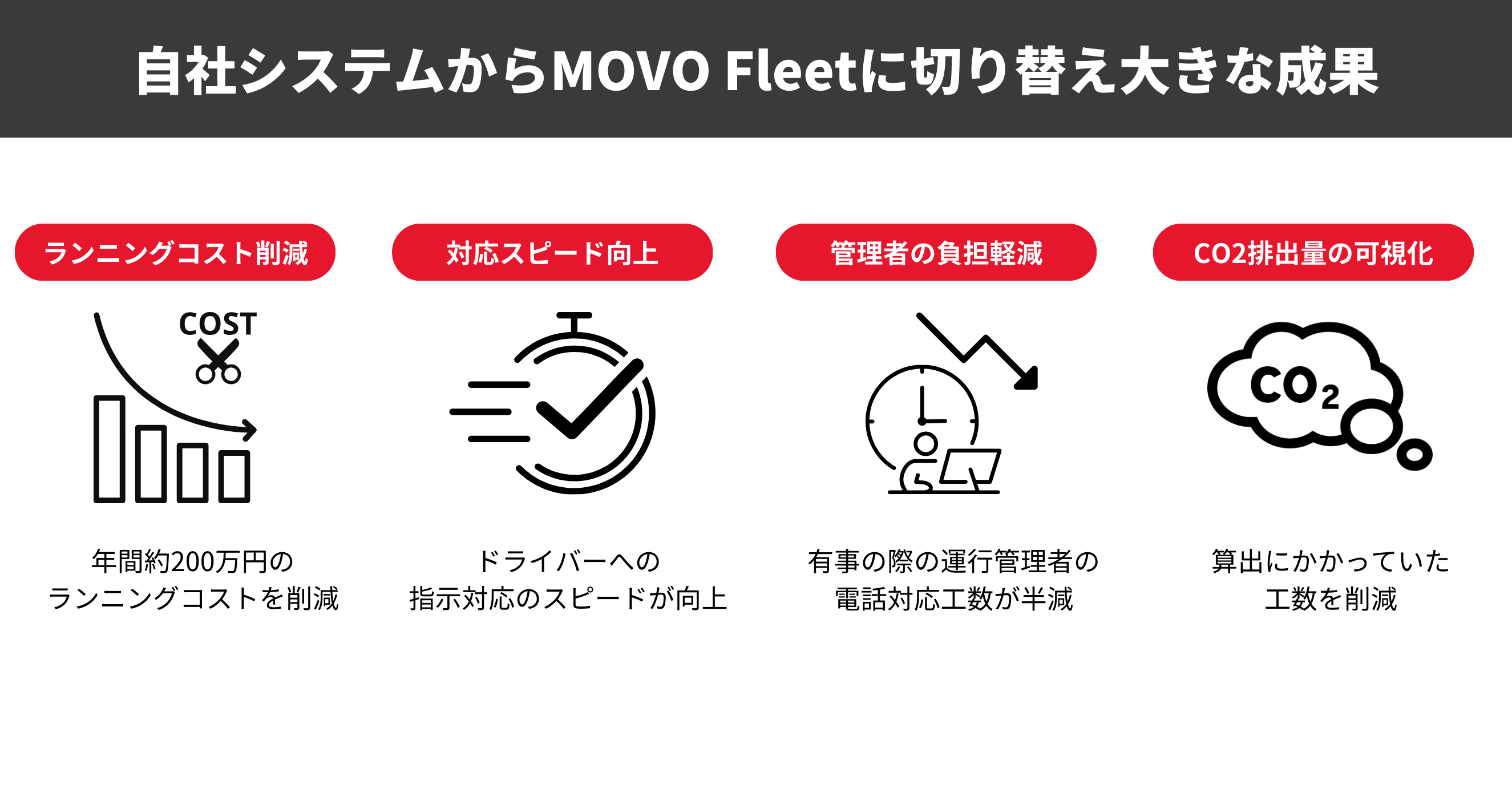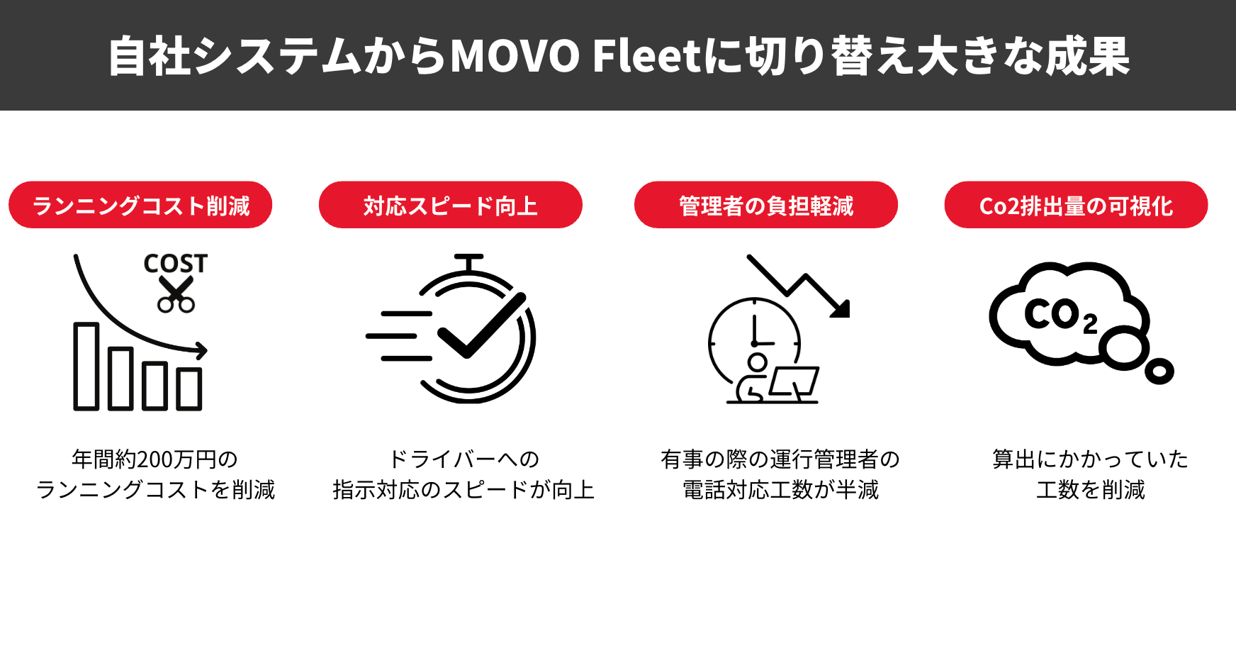 以前の自社システムと比較すると、年間約200万円のランニングコストを削減することに成功しました。システム導入のコストを負担する各営業所では、MOVO Fleetの導入後、ランニングコストが下がり、良い成果を得られていると実感いただいています。