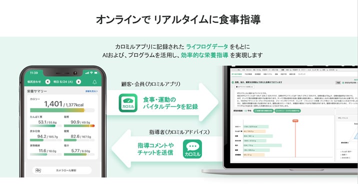 指導対象者(顧客)の「カロミル」アプリと連携し、食事や栄養指導がすべてオンライン上で完結できる、指導者向けのウェブツールです。指導対象者(顧客)の食事データの記録・蓄積が自動化されるだけでなく、AIが食事内容を自動で解析・栄養計算し、指導者の栄養計算など食事指導にかかる手間が大幅に削減されます。