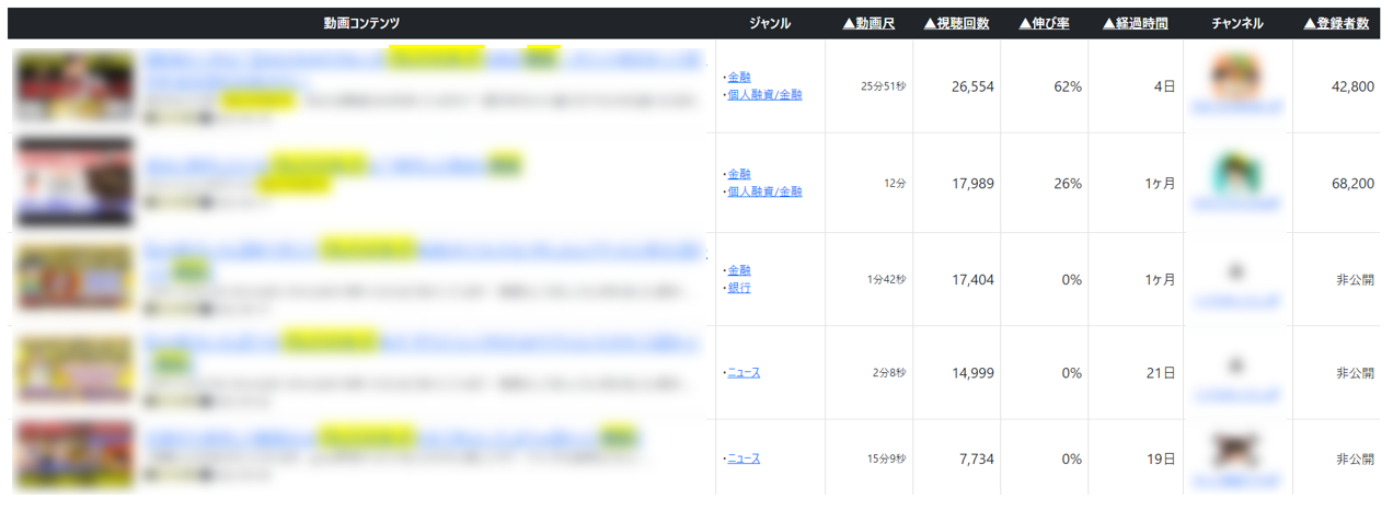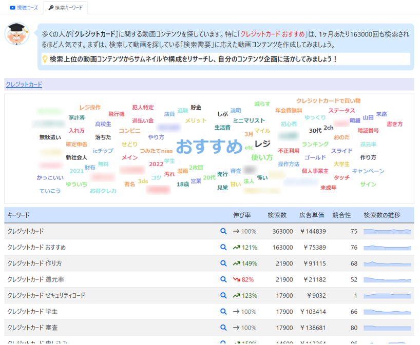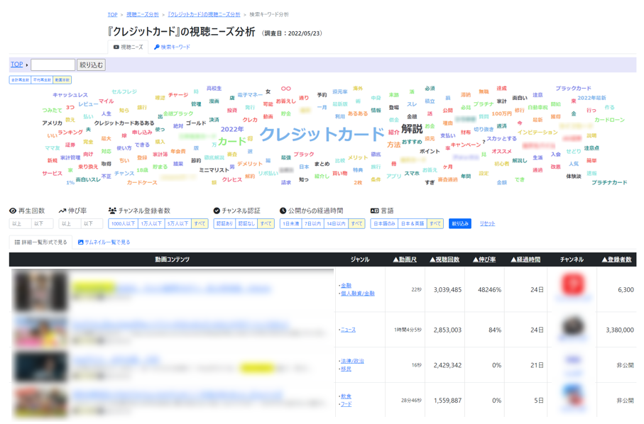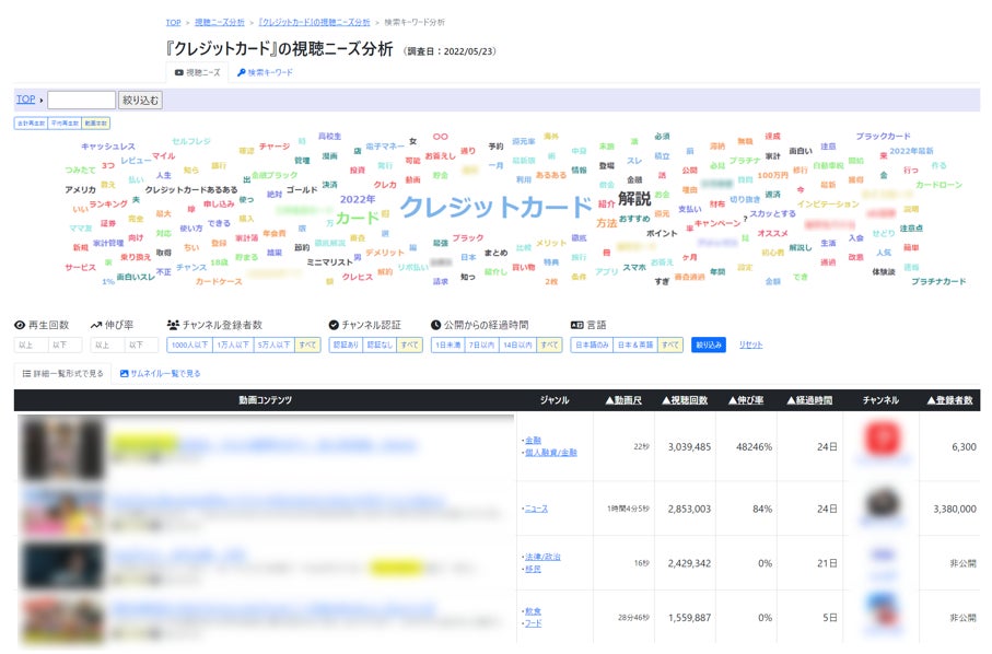 (下)テーブル表示:「クレジットカード」の関連動画として再生されている動画の一覧