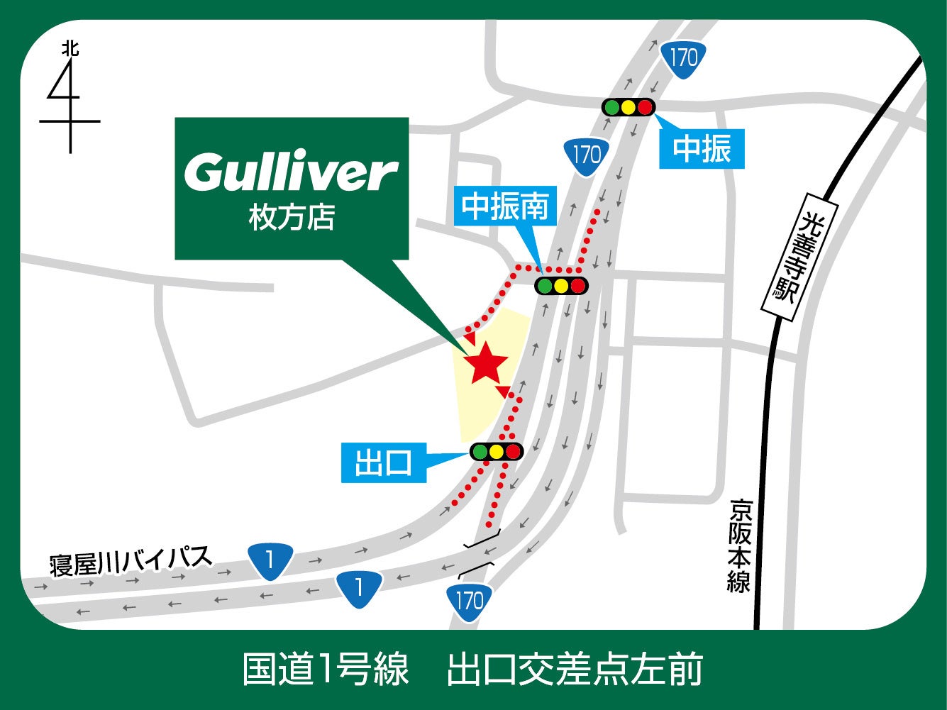 当店は、国道1号線と170号線が交差する「中振南交差点」付近に位置しており、大阪府内はもちろん、京都方面からのアクセスも良好です。さらに、京阪本線「光善寺駅」から徒歩圏内にあるため、おクルマを初めて検討される方にもご来店いただきやすい立地となっています。