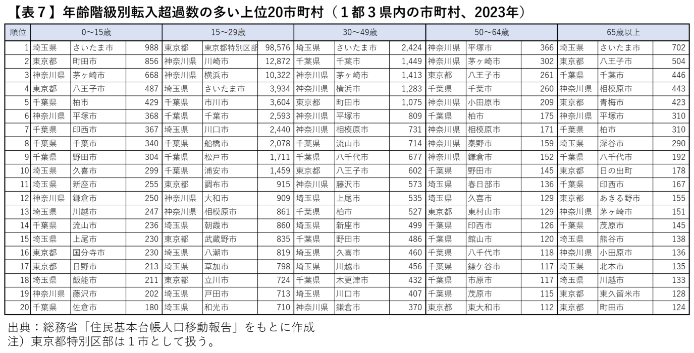 東京圏への人口流入の中核をなしている15~29歳(若年層)の転入超過数では、東京都特別区部が9万8576人と圧倒的に多く、次に川崎市、横浜市、さいたま市といった都心近郊の政令指定都市、そして市川市、千葉市、川口市、船橋市、松戸市が続いています。