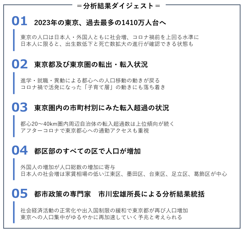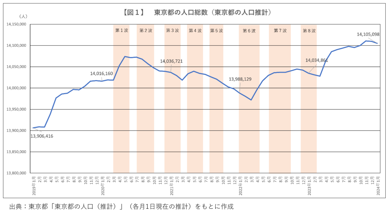 そこで本レポートでは、2023年の東京都及び東京圏、そして東京都区部の人口動向を詳しく分析するとともに、コロナ流行前(2019年)、コロナ禍(2020~2022年)、アフターコロナ(2023年)の5年間の人口の推移について総括していきます。