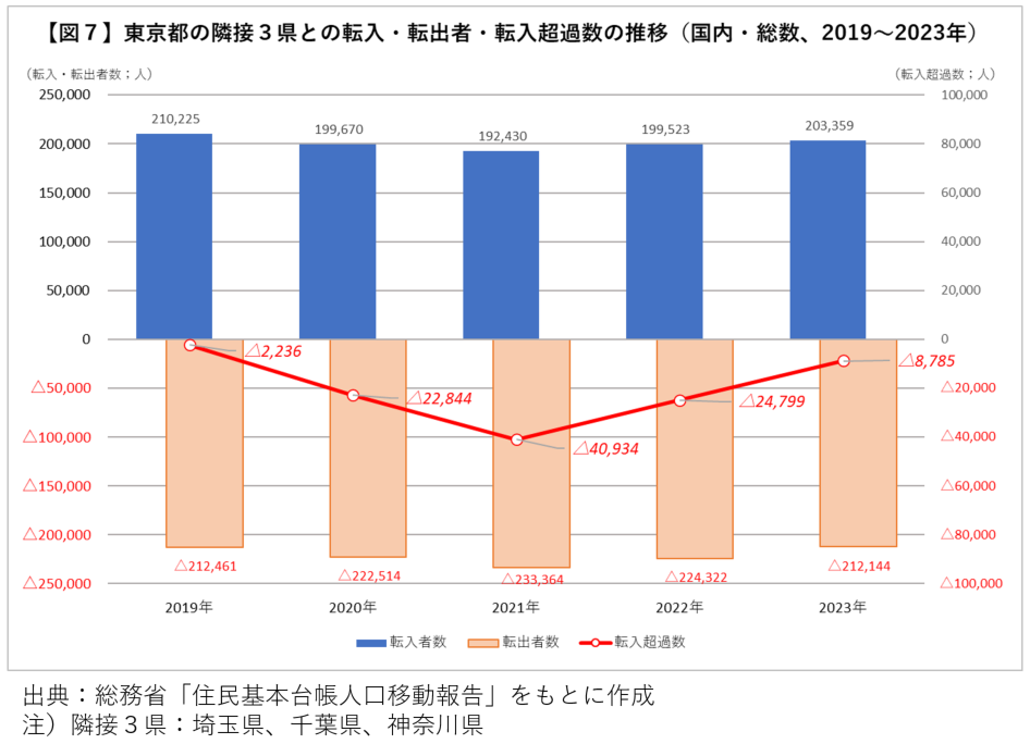 ここで、この5年間の東京都から隣接3県への転出超過の推移をみると、流行前2019年には転入者数21万225人、転出者数21万2461人で、2236人の転出超過に過ぎませんでしたが、2021年に転入者数19万2430人、転出者数23万3364人となって転出超過数は4万934人まで激増しました。2023年には転入者数20万3359人、転出者数21万2144人、転出超過数は8785人でようやく落ち着きをみせています。コロナ禍ピークの2021年には、隣接3県から東京都への転入を控え、東京都から隣接3県への転出が膨らんでいた状況だったことがみてとれます【図7】。