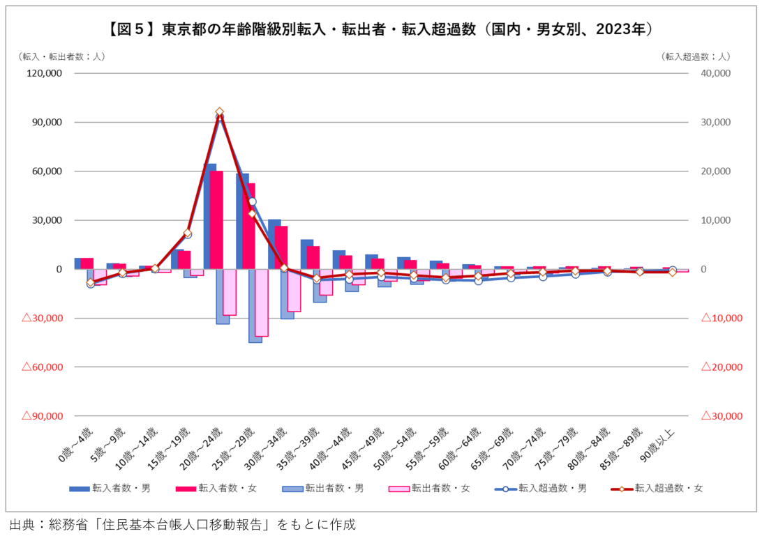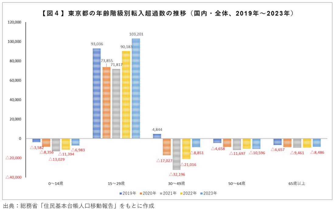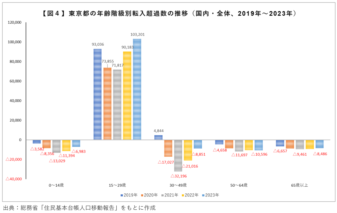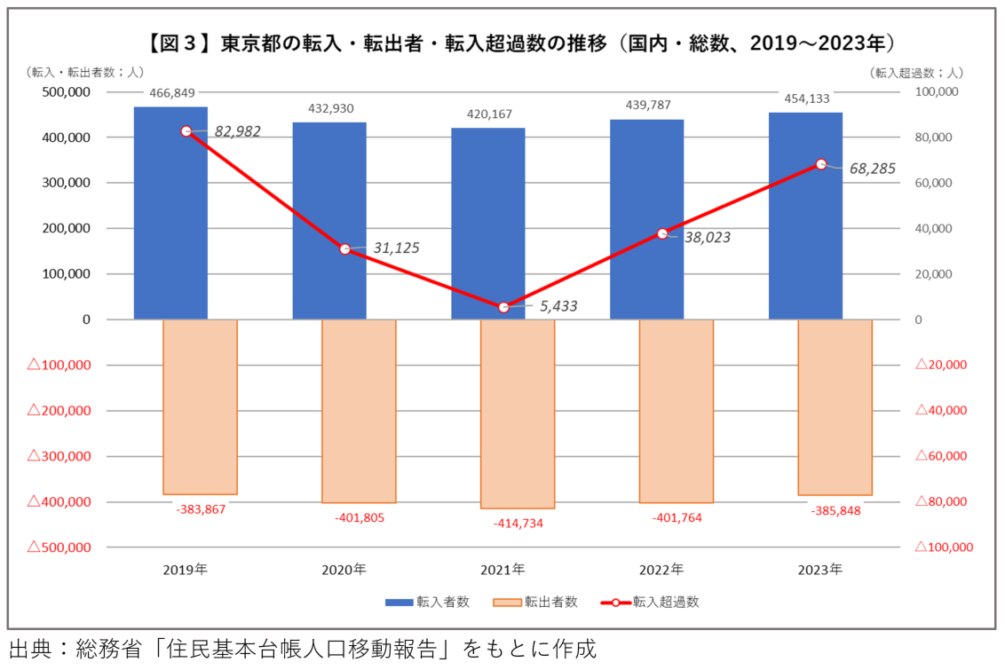コロナ流行前、コロナ禍、アフターコロナの5年間の推移をみると、流行前2019年には転入者数46万6849人、転出者数38万3867人で、8万2982人の転入超過でしたが、コロナの感染拡大により転入者数の減少、転出者数の増加が顕著になり、コロナ禍ピーク2021年には転入者数42万167人、転出者数41万4734人となって転入超過数は5433人まで激減しました。2022年以降ようやく転入者数、転出者数とも回復傾向が見られ、2023年の転入超過数は流行前の8割程度の水準まで回復するに至っています【図3】。