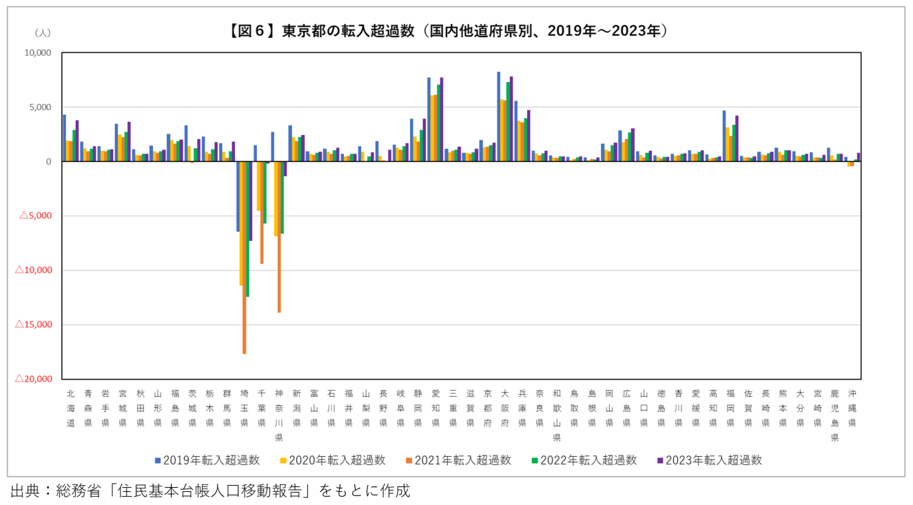 2022年との比較では、隣接3県への転出超過数は大幅に減少し(埼玉県:2022年△1万2458人→2023年△7274人、千葉県:△5683人→△178人、神奈川県:△6658人→△1333人)、他の道府県のうち秋田県、福井県、徳島県、熊本県を除く39道府県で転入超過数が拡大しています【図6】。