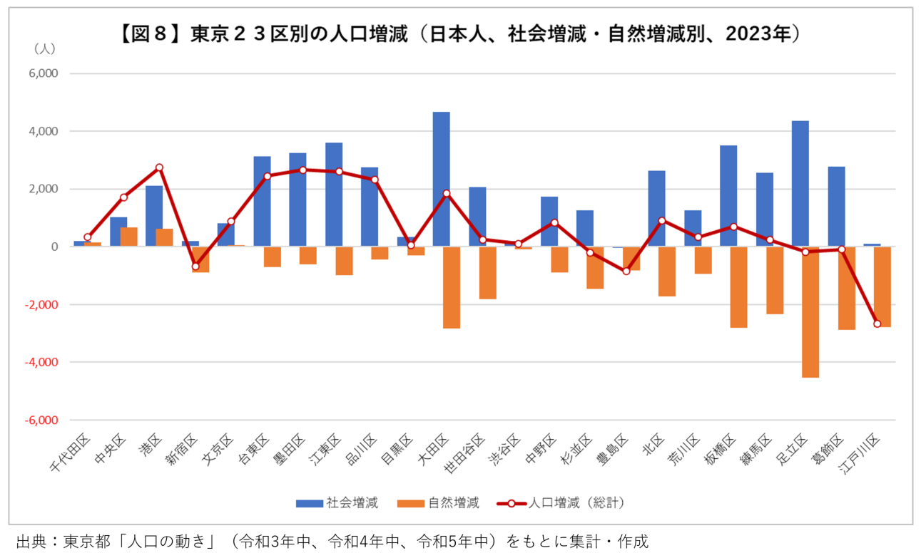 港区や中央区といった都心エリア、墨田区、江東区、台東区、品川区などの城東・城南の湾岸エリアでは再開発が進み、若い世代が住み始めて自然減が低く抑えられつつ、引き続き人口の流入も続いていると考えられます。また大田区は、交通利便性の高さから就職時に若者が転居するケースが多く、大幅な社会増につながったと推測できます。(以下略)
