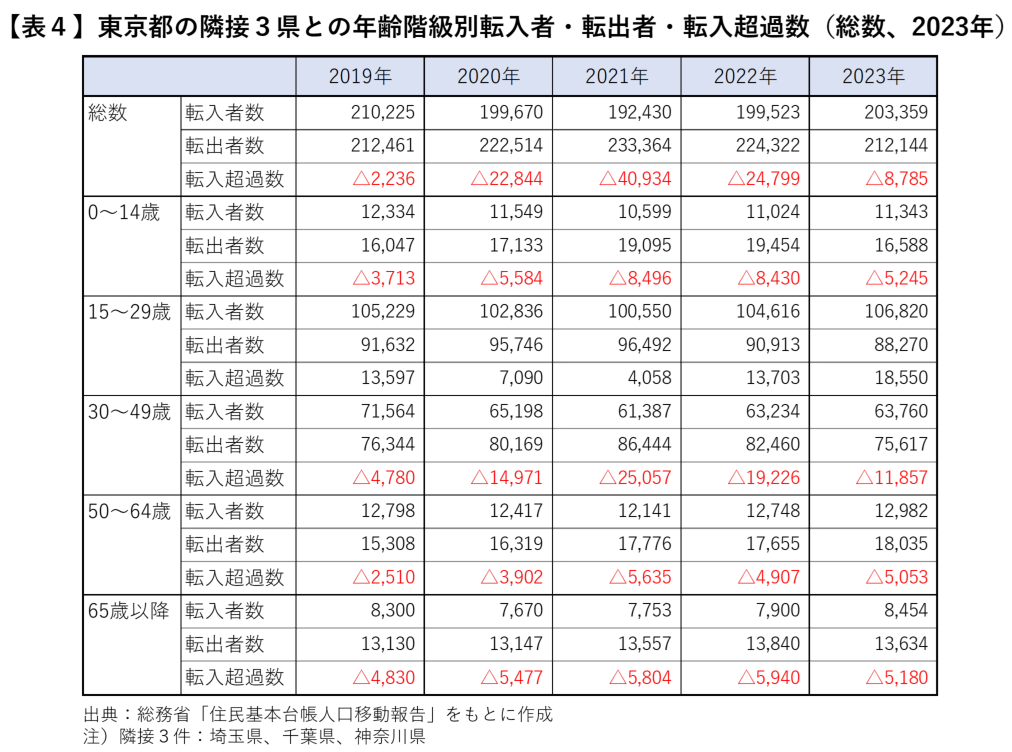 また、この転入・転出超過の推移を年齢階級別にみると、2021年は2019年と比べて、15~29歳(若年層)で転入超過数が9539人減る一方で(2019年1万3597人→2021年4058人)、30~49歳(青壮年層)と0~14歳(子ども層)で転出超過数がそれぞれ2万277人(△4780人→△2万5057人)、4783人(△3713人→△8496人)増えています。コロナ禍において東京都から隣接3県への大幅な転出超過の要因は、若年層の転入超過の低下と青壮年層と子ども層(いわゆる「子育て層」)の転出超過の拡大であったことが改めて認識できます【表4】。