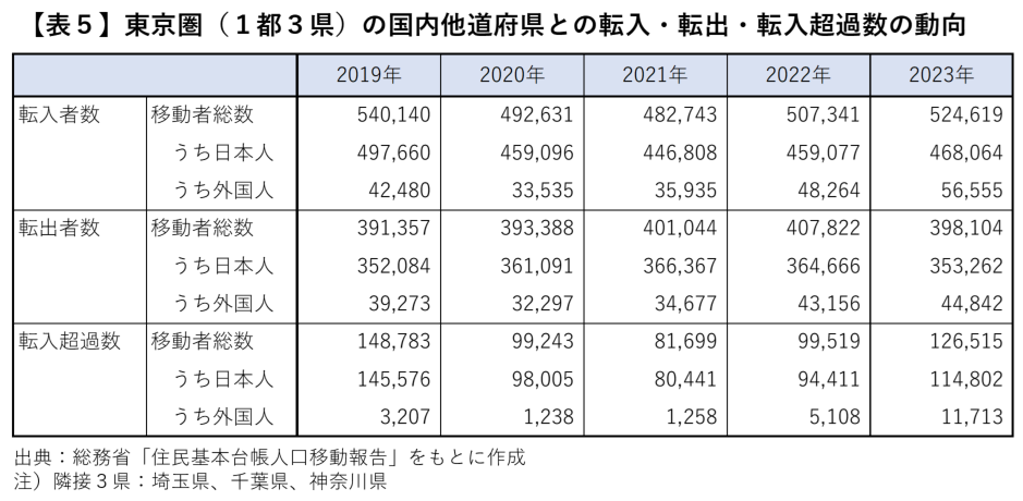 5年間の推移をみると、流行前2019年からコロナ禍ピークの2021年にかけて転入超過数は14万8783人から8万1699人と激減しましたが、その内訳をみると転入者数が54万140人から48万2743人と5万7397人減少する一方で、転入者数は39万1357人から40万1044人と9687人の増加に留まり、転入者数の大幅減少が大きな要因だったことが分かります。つまり、コロナ禍であっても東京圏から他道府県へ転出する動きはそれほど拡大しなかったとみることができます。2023年には転入者数が流行前とほぼ同水準まで回復したことで、転入超過数は流行前の85%まで回復するに至っています【表5】。