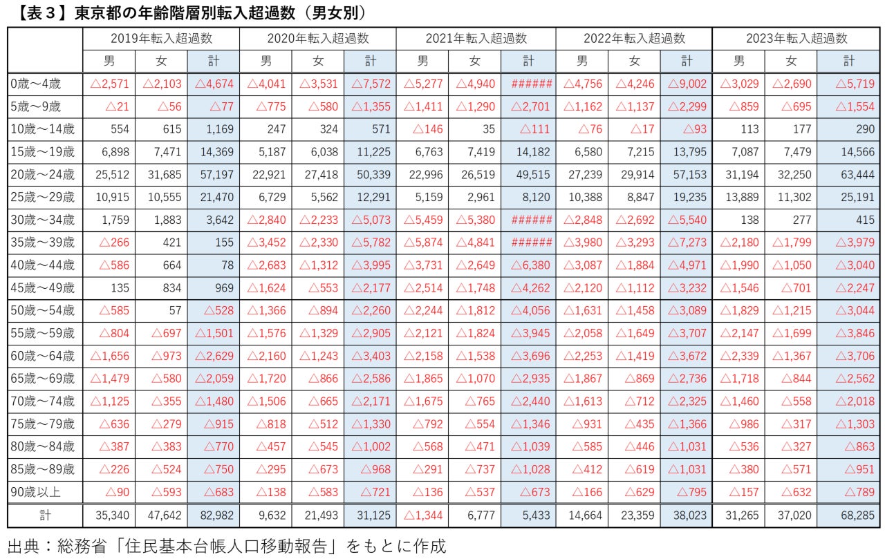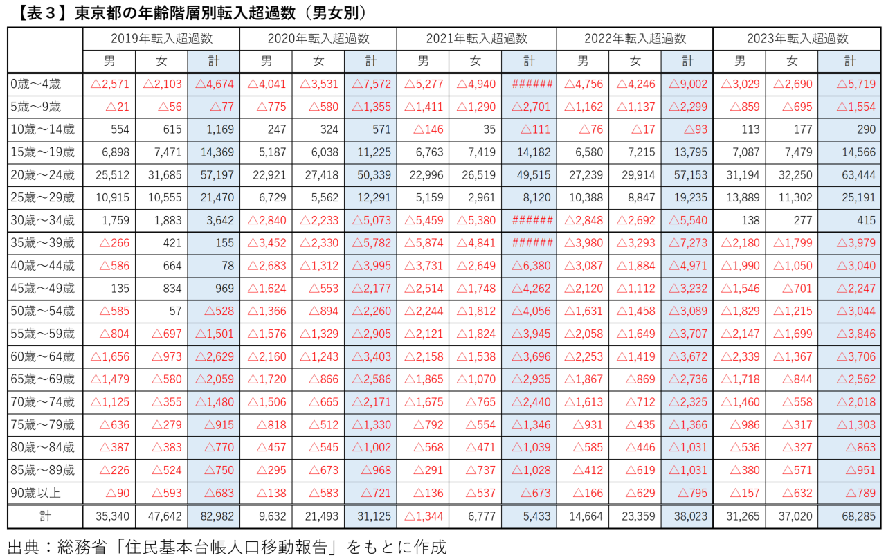 この東京都の転入・転出状況を年齢5歳階級別・男女別にみていきます【表3】。