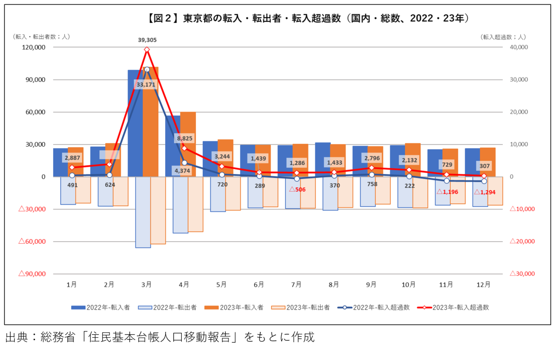 東京都の国内他道府県との転入・転出状況をみると、年間の転入者数は45万4133人、転出者数は38万5848人で、6万8285人の転入超過となりました。転入超過数は2022年から3万262人増え、2年連続で前年を超えています。月別でみても、3月に3万9305人、4月に8825人の大幅な転入超過となり、すべての月で転入超過が続きました【図2、表2】。