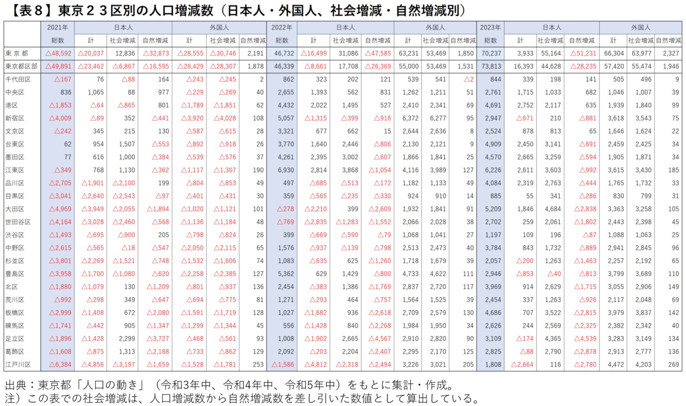 東京都区部全体では、2021年に総数で4万9891人の減少を記録しましたが、2022年に4万6339人の大幅増加に転じ、2023年には7万3813人の増加となりました。その内訳を日本人・外国人別にみると日本人が1万6393人増、外国人が5万7420人増と、外国人の人口増加が大きく寄与していることが分かります【表8】。